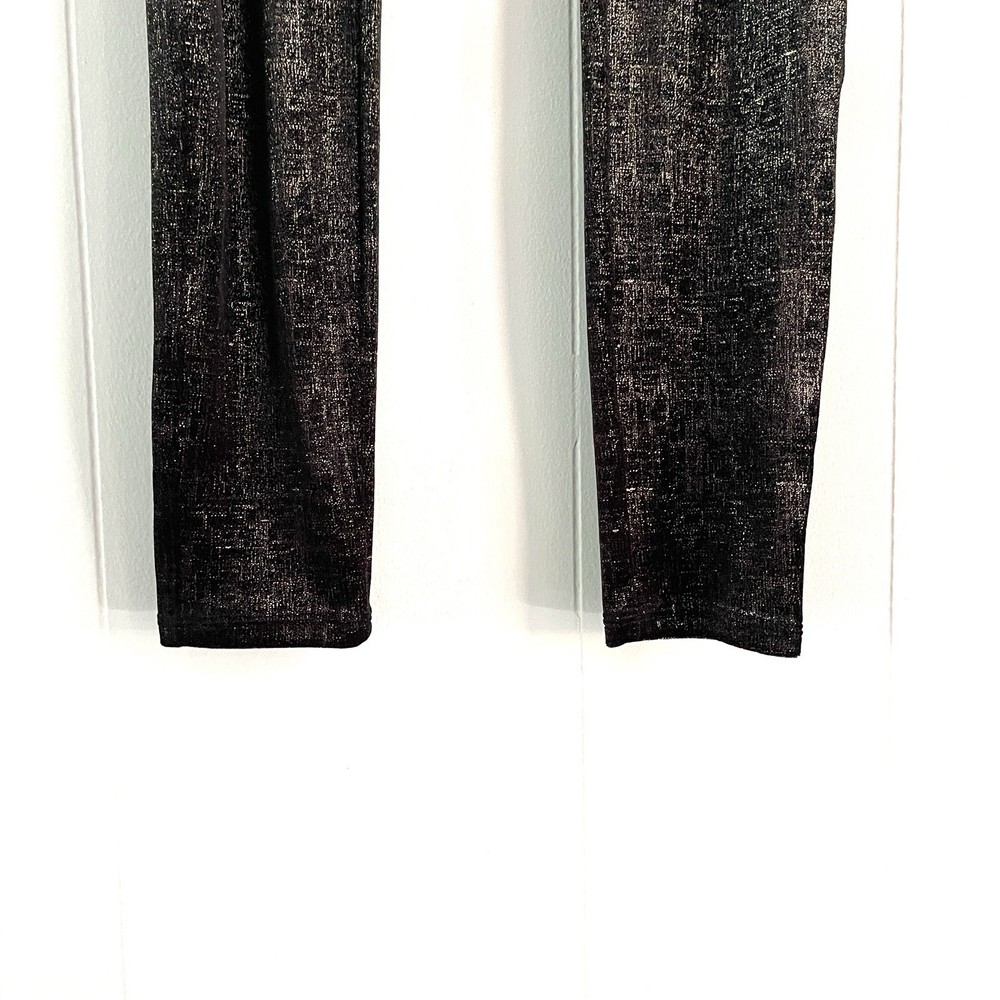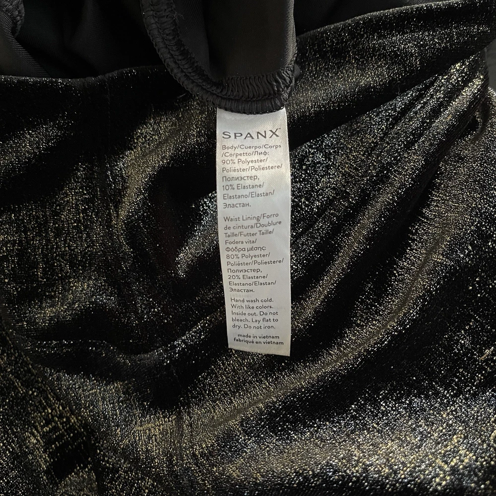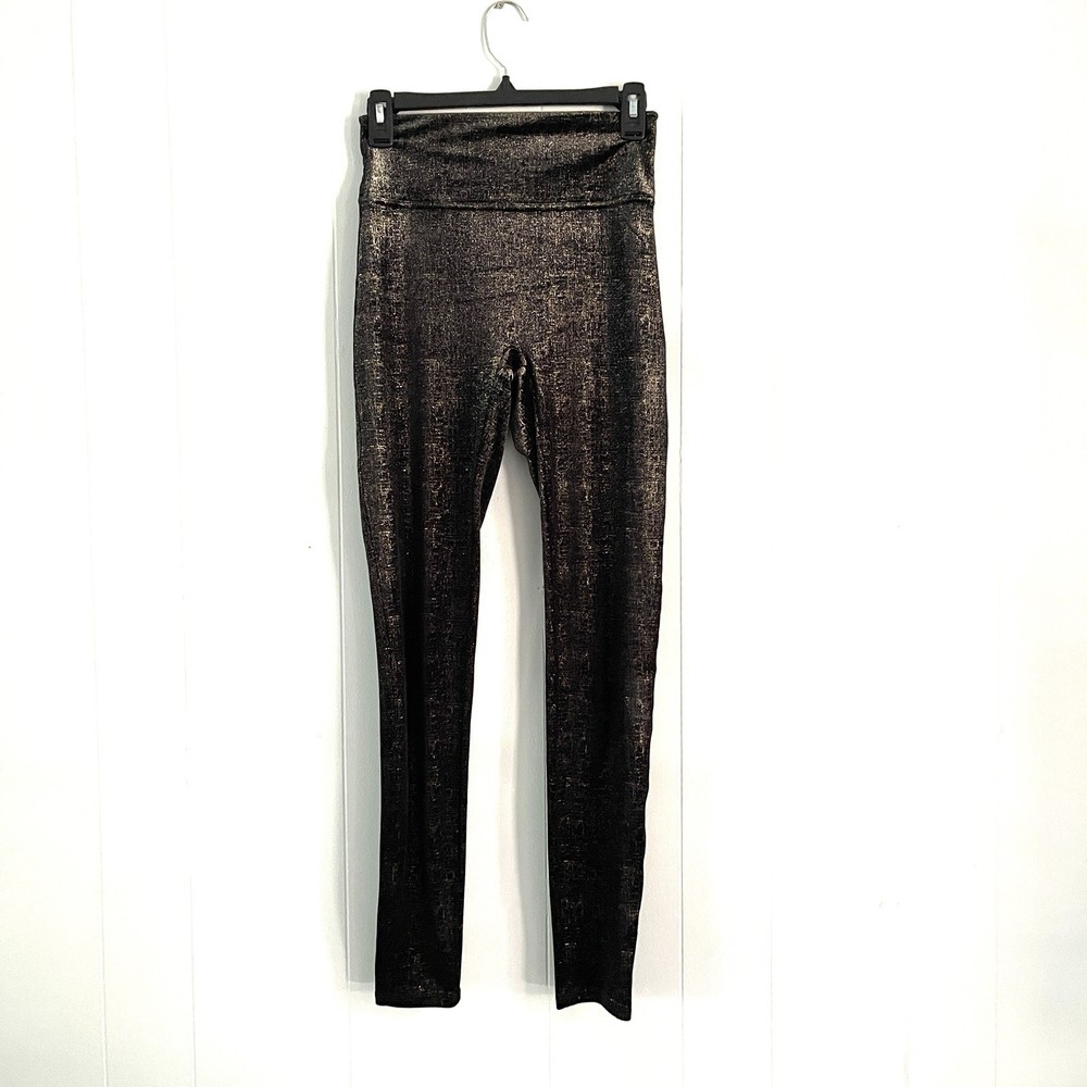 Type: Leggings Season: Winter, Summer, Spring, Fall Handmade: No Accents: N/A Color: Black Country/Region of Manufacture: Vietnam Size Type: Regular Size: S Occasion: Casual, Travel, Party/Cocktail Inseam: 28 in Rise: Mid (8.5-10.5 in) Material: Polyester, Elastane Style: Legging Product Line: N/A Character: N/A Department: Women Personalize: No Pattern: Metallic Foil Brand: Spanx Vintage: No Fabric Type: Blended Fabric Theme: Metal, Shiny, Athleisure, Glam, Party, Night Out, Metallic, Holiday Garment Care: Machine Washable Waist Size: 24 in Fabric Wash: N/A Features: Shaping, Stretch, Slimming, Comfort, Easy Care Model: Spanx Foil Performance/Activity: N/A