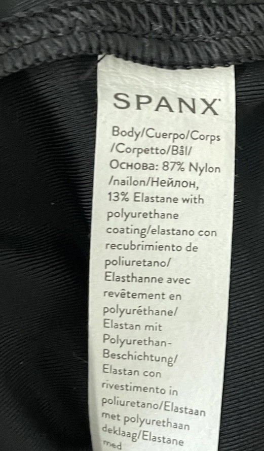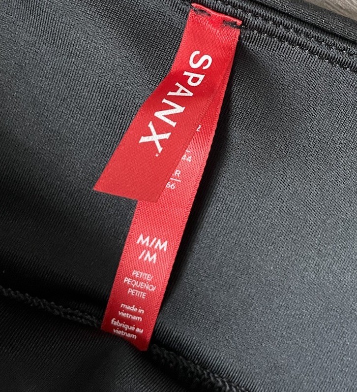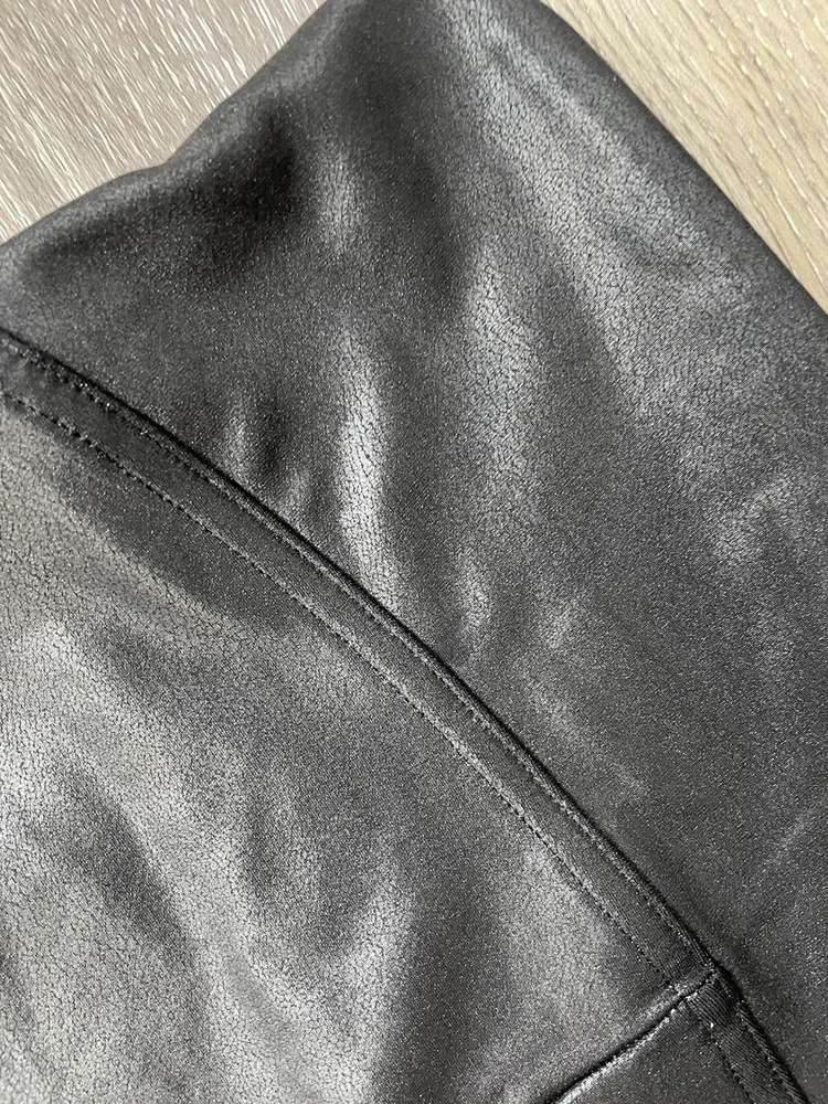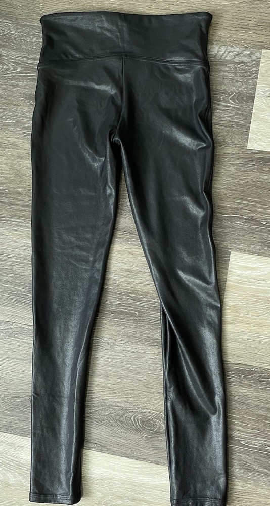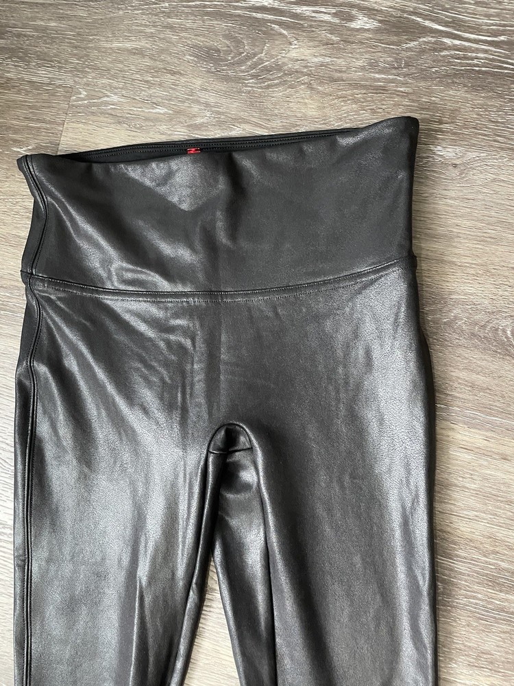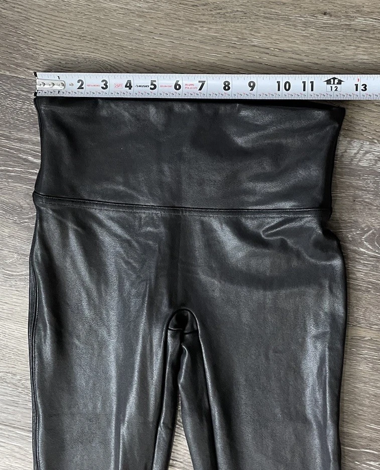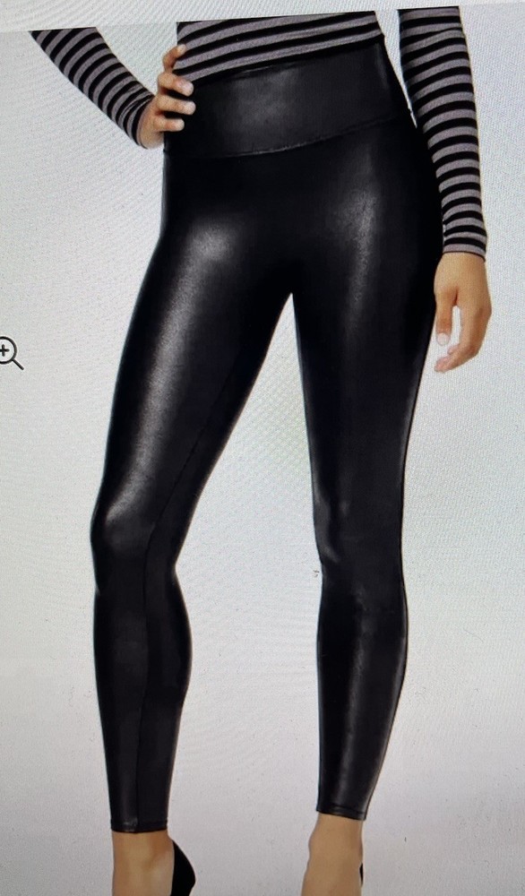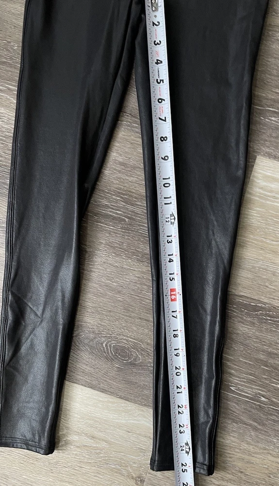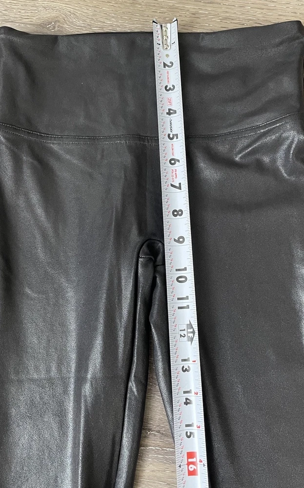 Spanx petite medium pull on faux leather leggings Pull-on style The slim's built in- shaping waistband with hidden power mesh Wear these fashion forward pants with anything-easy to dress up or down A more structured fit and pant-like feel Machine washable Nylon/spandex; waist lining: polyester/spandex approx measurements in photos