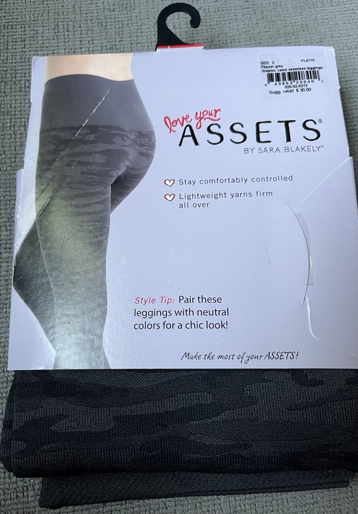 The product is a pair of Spanx Sara Blakely seamless leggings in a black, designed for women in size small. These leggings feature a camouflage pattern in black and are made from a blended fabric. They have an ankle length style, making them perfect for various activities while providing a comfortable and stylish option. The seamless design adds to the overall appeal of these leggings, making them a versatile addition to any wardrobe.