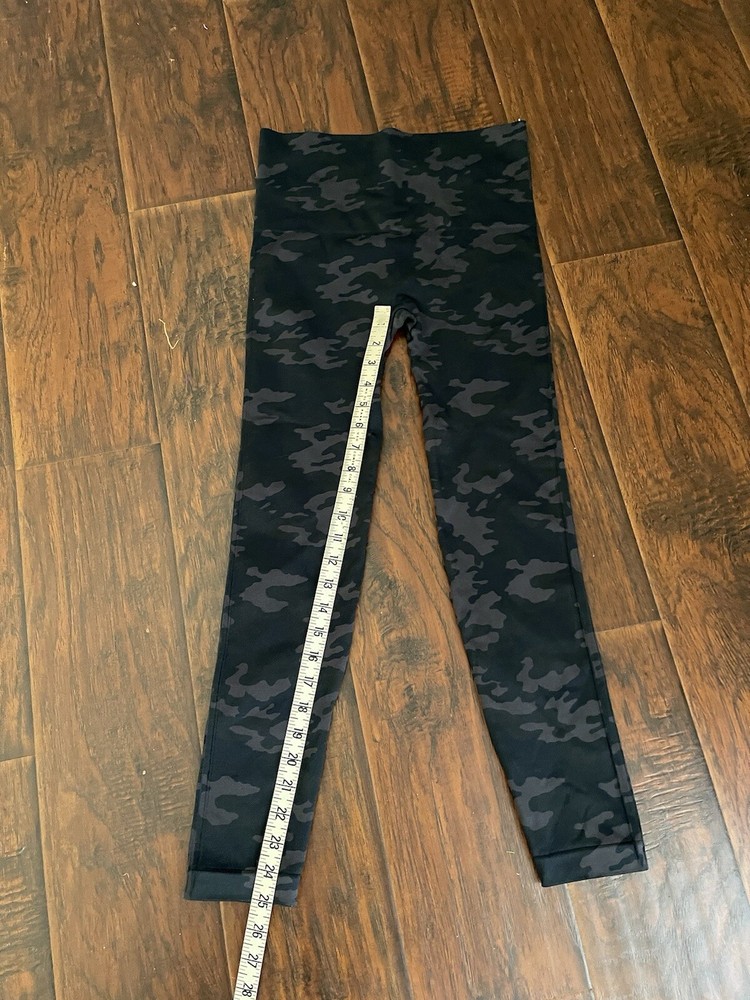 The Spanx Seamless Shaping Leggings in size L are designed for women and feature a camouflage pattern in black. These ankle-length leggings are ideal for athletic activities such as gym training, walking, yoga, and bodybuilding. They offer shaping benefits and a seamless design, making them suitable for both athletic performance and casual athleisure wear.