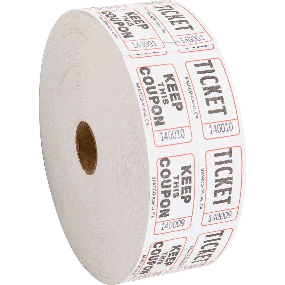 Tickets with a coupon help control admission to events. Each ticket is preprinted with the message, "Ticket" on one half and "Keep this Coupon" on the other. Both halves of each ticket have the same number preprinted on them for easy tracking. Tickets are consecutively numbered. Each roll includes 2,000 tickets. • 2,000 tickets per roll. • Double perforated. • 0% recycled content. • Double roll tickets are consecutively numbered. • Sold as 2000/Rolls. eBay STORE ABOUT US SAVE SELLER CONTACT US Sparco Ticket Roll Double w/Coupon 2000/RL White 99210 - Sold as 2000/Rolls Tickets with a coupon help control admission to events. Each ticket is preprinted with the message, "Ticket" on one half and "Keep this Coupon" on the other. Both halves of each ticket have the same number preprinted on them for easy tracking. Tickets are consecutively numbered. Each roll includes 2,000 tickets. • 2,000 tickets per roll. • Double perforated. • 0% recycled content. • Double roll tickets are consecutively numbered. • Sold as 2000/Rolls. You may be interested in our other listings on eBay.