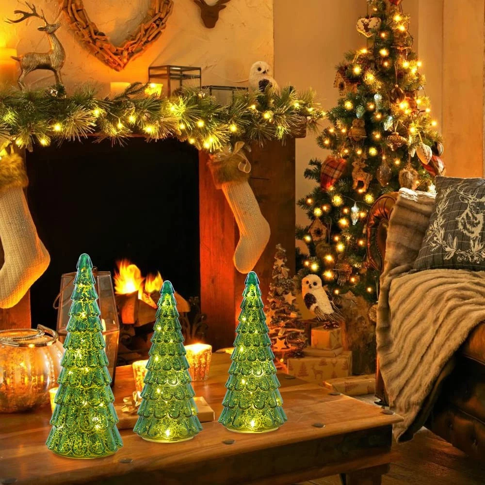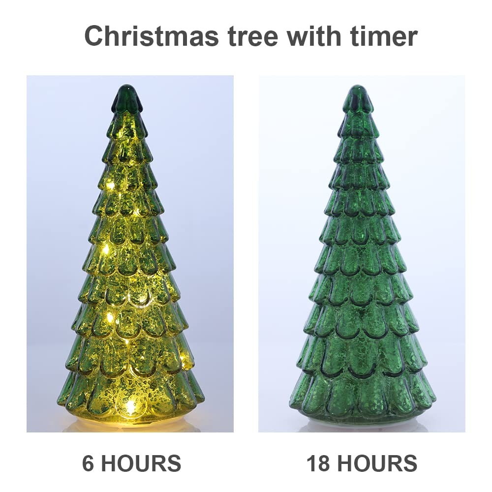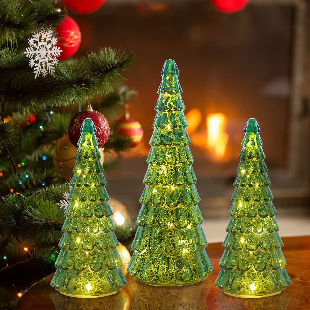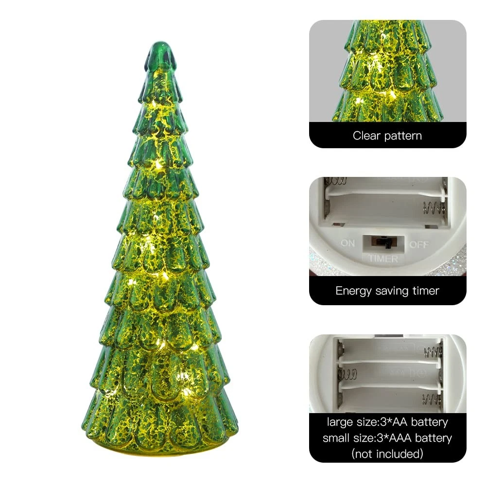 Christmas Decorations for The Home, 3 pcs Sparkling Glass Christmas Tree with LED Lights and Timer, Tabletop Christmas Tree Decor, Xmas Tree Decorations for Fireplace, Home Decor Indoor ☃️ MERRY CHRISTMAS - Bring the tasteful holiday look and Add a touch of glam to your home with 3 pcs Sparkling Glass Christmas Tree with LED Lights and Timer and Timer. Welcome friends and family to your home for Christmas with this cheerful snowman decoration that has a fluffy scarf and tall hat. Classic twig arms and a carrot nose complete the look and fill it with holiday cheer. The glassy design turns on the lights to bring a sparkle to your home. ☃️ BATTERY POWERED WITH TIMER - Sparkling Glass Christmas Tree with lights is 3 AA batteries (NOT INCLUDED) powered, features a timer mode (6 hours on, 18 hours off) for automatic on/off convenience. Push the switch(Off/Timer/On) to the middle to activate TIMER. Just need to turn the timer on one time, it lights up in the pre-programmed timing sequence of 6 hours on and 18 hours off every day. ☃️ LIGHT UP YOUR CHRISTMAS SPACE - This Christmas Tree measures 4.7'' in diameter and small glass tree measures 3.9'' . Built to endure many holidays with LED string lights (Battery Powered, Batteries not Included, Need 3 AA batteries). Our time-tested needles are fire resistant and non-allergenic. Bring a charming and festive glow to light up your house. ☃️ IDEAL CHRISTMAS GIFTS - Give your Christmas tree the perfect perch this holiday season with this sparkling Christmas Tree. The perfect finishing touch at the bottom of your well-decorated tree at home, outdoor, school, store, office, supermarket etc. Ideal Christmas gift for your family, friends, colleagues, neighbors. ☃️ WHAT YOU GET - The Christmas decorations is sure to put your family and friends in the mood to celebrate. Amazing right? There’s more! 90 days warranty and 24/7 customer online support give you the best shopping experience ever!