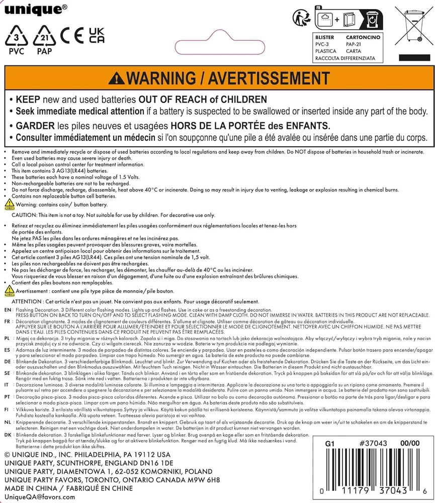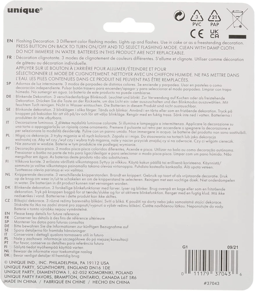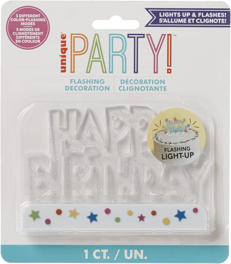 DAZZLING DISPLAY: Make your birthday celebration extra special with our eye-catching Dazzling Flashing Happy Birthday Cake Decoration. Measuring 3.25" x 4.75", it's the perfect size for a spectacular centerpiece on any cake or dessert. DURABLE & REUSABLE: Crafted from high-quality materials, this cake decoration is built for durability and long-lasting use. Reuse it for future birthdays, making each celebration just as unforgettable as the last. EASY TO USE: Our Happy Birthday Cake Decoration is designed with convenience in mind. Simply insert the included batteries, switch it on, and place it atop your cake for an instantly dazzling display of celebratory joy. FINISHING TOUCH: Featuring bright lights, this fabulous cake decoration will surely impress your guests and create memorable moments. Watch as the vibrant colors and flashing patterns put the perfect finishing touch on your special day. PERFECT GIFT IDEA: Searching for a unique and thoughtful gift for a loved one's birthday? Look no further! Surprise them with our Dazzling Flashing Happy Birthday Cake Decoration and elevate their celebration experience. Turn any birthday cake into a show-stopper by topping it off with this Flashing "HAPPY BIRTHDAY" Cake Decoration. With bright stars and polka dots adorning the base and three different color-flashing modes operated with the push of a button, this cake topper can be used with candles or as an alternative. Not just for the birthday cake, this flashing decoration will add bold, blinking color to a tray of brownies, a cheesecake, or any other delicious dessert at the birthday party. Unlike traditional birthday candles, this decoration can be reused year after year