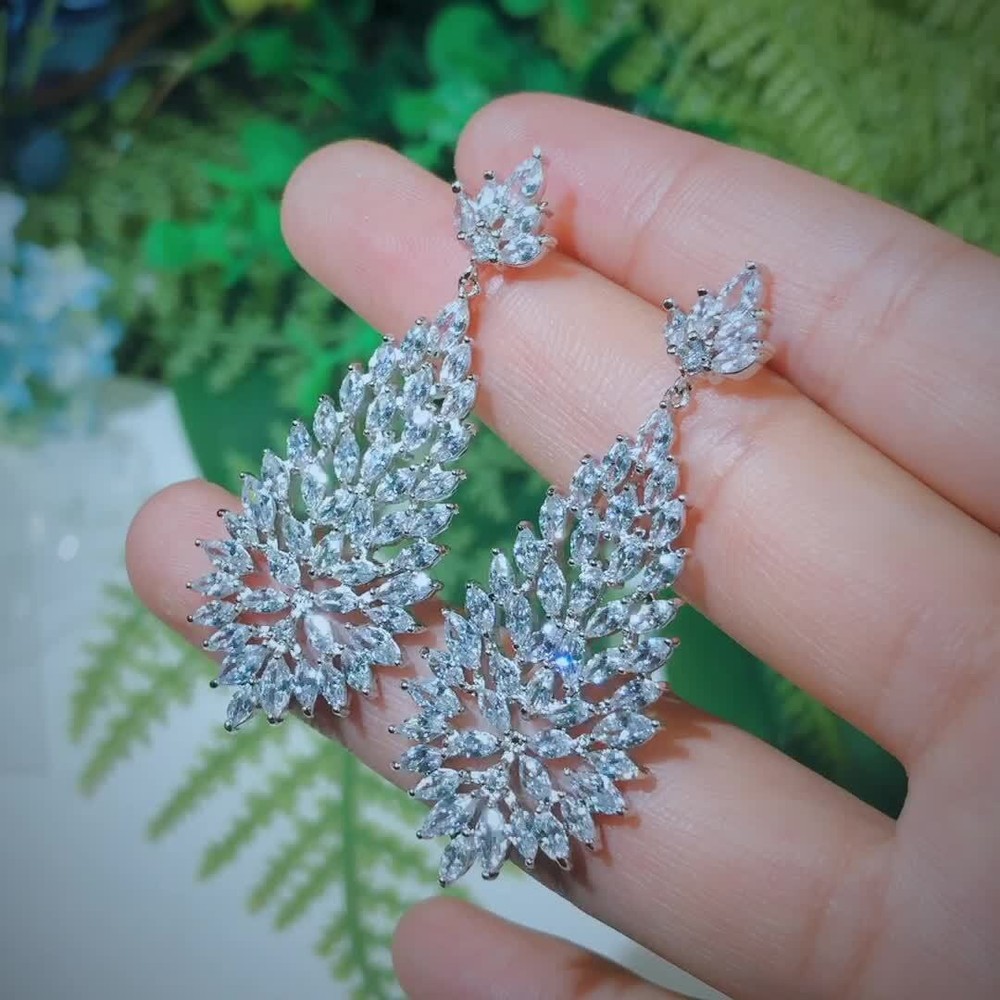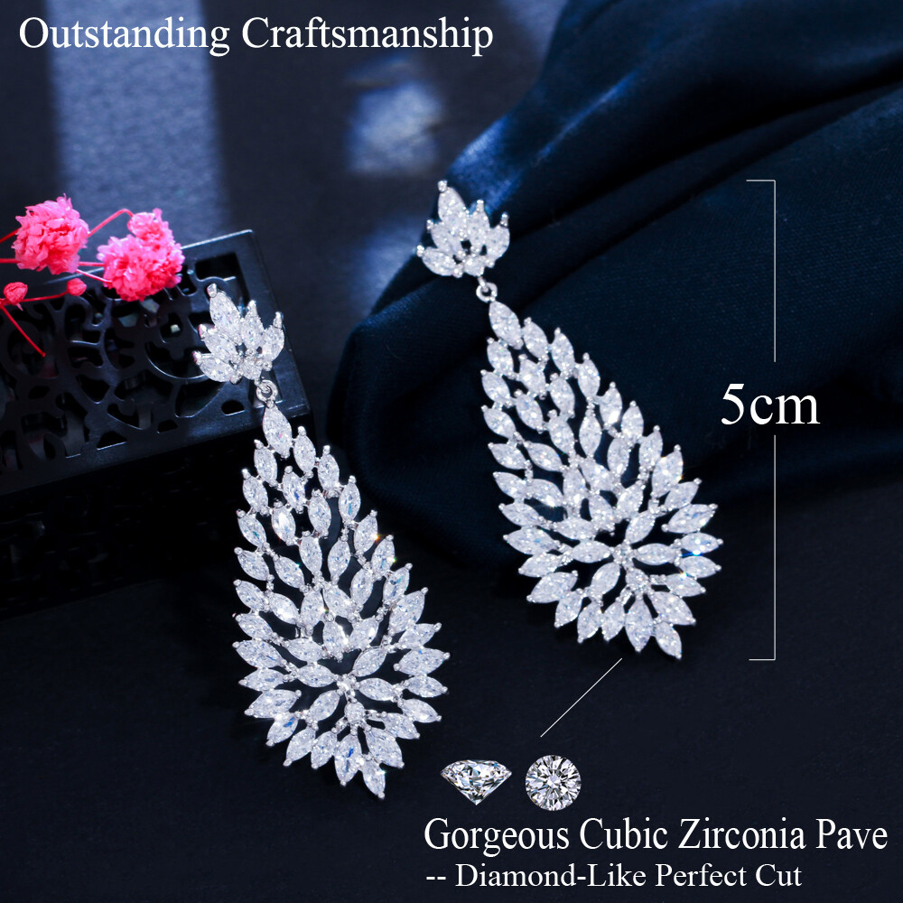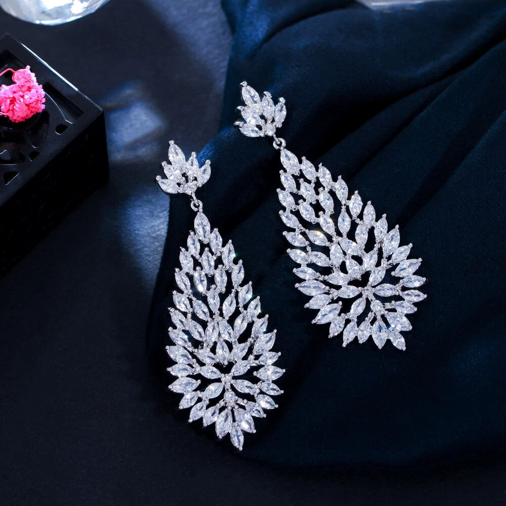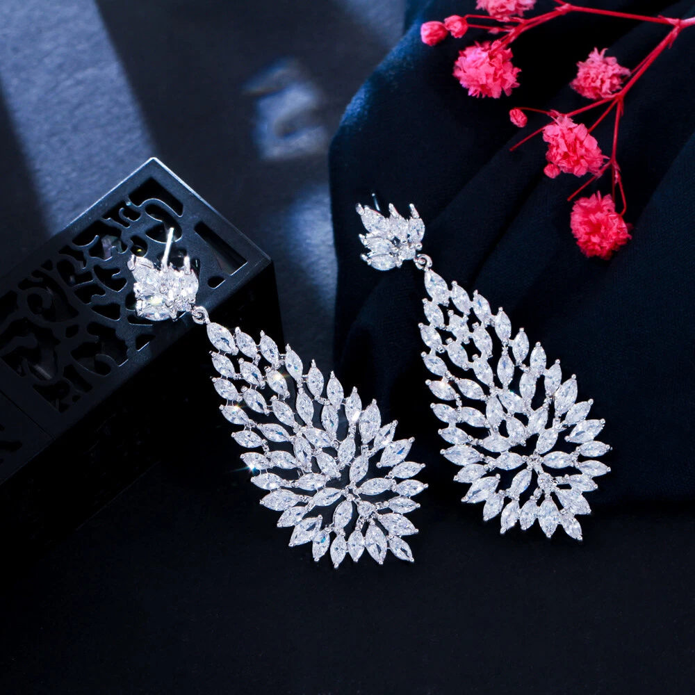 Sparkling Silver Plated Marquise Zircon Leaf Long Drop Dangle Earrings for Women