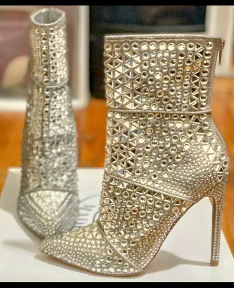 Boss-Up your shoe game with these Steve Madden Rhinestone Booties, a chic addition to any wardrobe. These mid-calf booties feature a striking silver leather upper, complemented by eye-catching rhinestone accents that are sure to add a touch of glamour to any outfit.Crafted for comfort and style, these booties come in a US size 10 and boast a supple leather lining, ensuring a luxurious fit. Whether you're dressing up for a night out or adding a sophisticated flair to your day wear, these Steve Madden booties are a versatile choice that doesn't compromise on elegance.