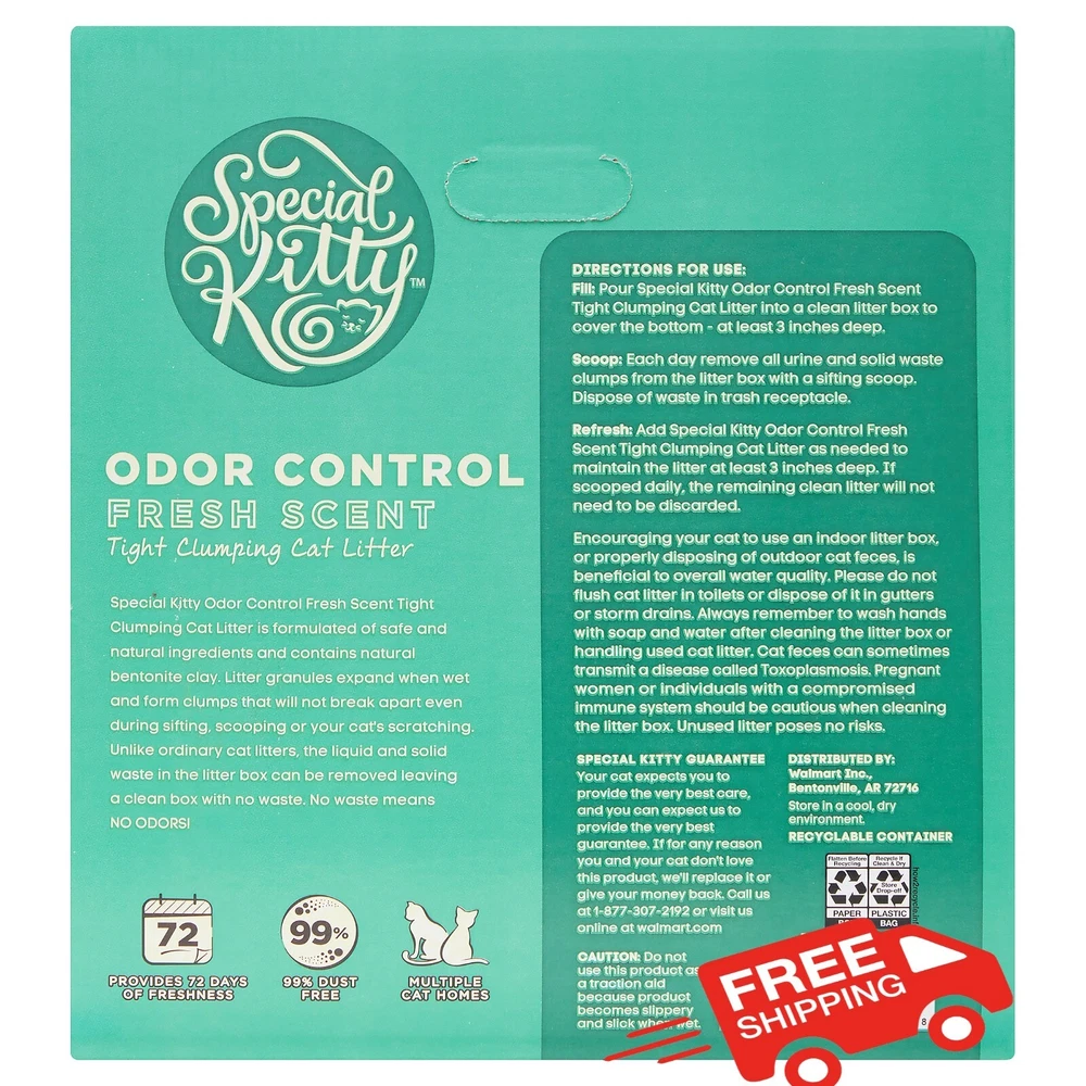 Special kitty fresh scent odor control tight clumping cat litter provides long-lasting freshness to keep your cat's area exactly that. Fill your cat's box with a fresh amount of litter and notice the difference immediately when you pour, as this litter, and special kitty promise, we know that cats rule, and are confident you would only provide the best cat litter. It is formulated of safe and natural ingredients and contains natural bentonite clay. Litter granules expand when wet and form clumps that will not break apart even during sifting, scooping, or your cat's scratching. Unlike ordinary cat litters, the liquid and solid waste in the litter box can be removed leaving a clean box with no waste. Long-lasting fresh-scented odor control to your home smelling fresh. The litter's tight clumping formula makes scooping a breeze. Recyclable plastic container. Provides up to 72 days of freshness. Great for multiple cat homes, this 40-pound box is optimally made to store away neatly and includes a handle hold for convenient maneuverability and easy pouring. Scent FRESH SCENT Animal Type Cat Animal Lifestage All Lifestages Container Type Jug Form Pebbles Color Green Brand Special Kitty Count Per Pack 1 Assembled Product Weight 42 lb Product Line Special Kitty Manufacturer Part Number SPKY MC 40X Model SPKY MC 40X Size 40 lbs Assembled Product Dimensions (L x W x H) 7.72 x 11.97 x 13.19 Inches Instructions Fill: Pour Special Kitty Scoopable Tight Clumping Cat Litter, Fresh Scent into a clean litter box to cover the bottom - at least 3 inches deep. Scoop: Each day remove all urine and solid waste clumps from the litter box with a litter scoop. Dispose of waste in trash receptacle. Refresh: Add Special Kitty Scoopable Tight Clumping Cat Litter, Fresh Scent as needed to maintain the litter at least 3 inches deep. If scooped daily, the remaining clean litter will not need to be discarded.