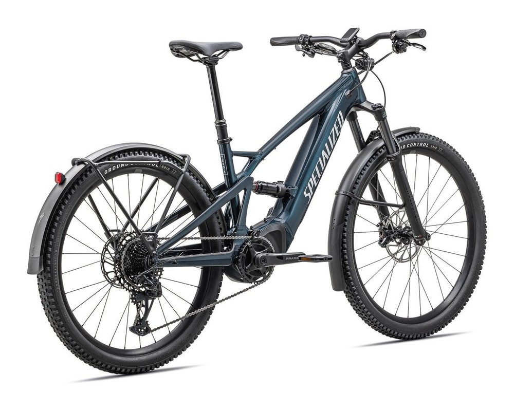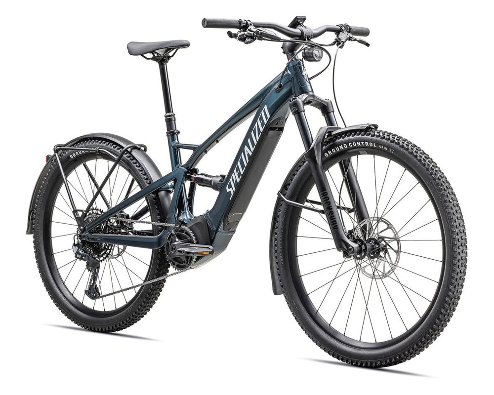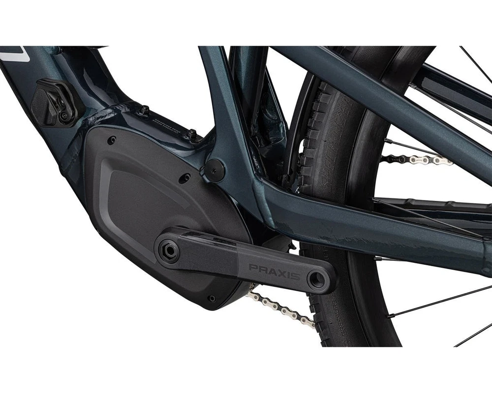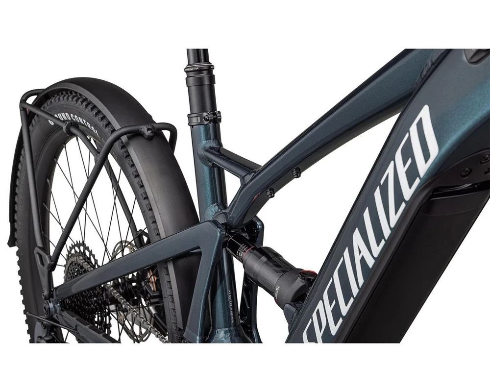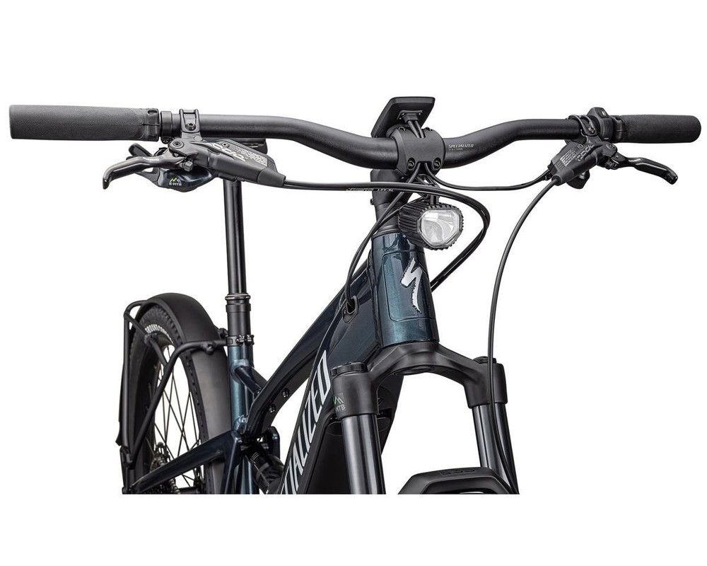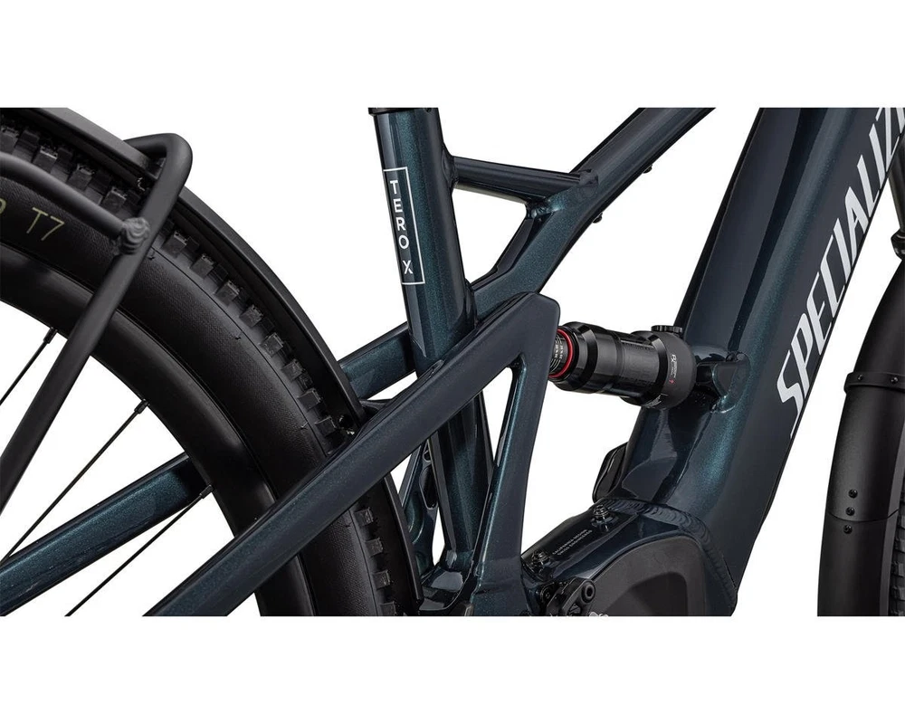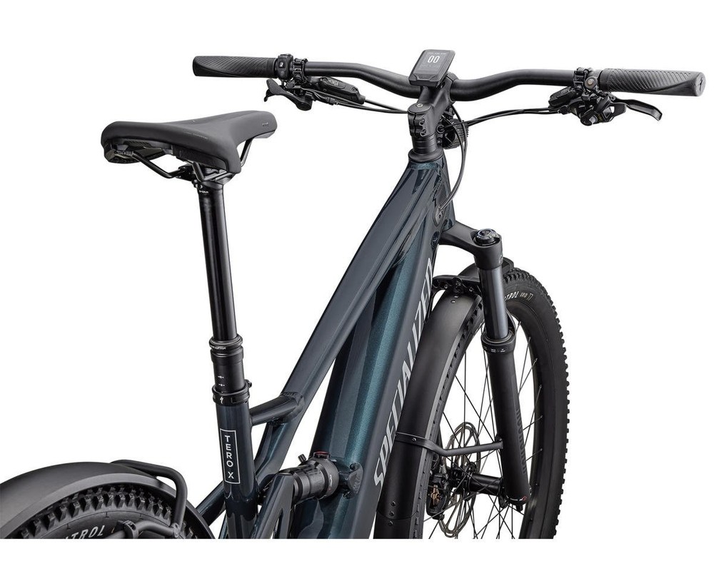 Specialized Turbo Tero X 5.0 E-Bike Description: The Specialized Turbo Tero X 5.0 E-Bike empowers riders to unfold more of the map when plotting their next bike adventure by providing longer range, more power, support for more accessories, and connectivity that will keep riders fully supported on their trip, no matter the distance. Built to lend users the versatility and performance of Specialized's Full Power 2.0 motor and Turbo Operating system, Turbo Tero X delivers adaptive control that can handle rugged terrain under the harshest conditions. Status display and control of the onboard pedal-assist system is available through the MasterMind display, which pairs seamlessly with Specialized's App, allowing users to further tune their bike's performance properties as well as enable security settings, including motor disable and motion sensor alarm with Turbo System lock. Tero X smooths out the roughest of roads and trails through an ultra-light E5 aluminum frame, built to support 120mm of rear travel and 130mm of front travel, unlocking ride-it-all capability. Optimal ride control is furnished by a mixed wheel size "mullet" setup, situating a 27.5" tire in the rear for acceleration and a 29" in the front for elevated handling. A confidence-boosting Tranz X infinitely adjustable dropper seatpost helps riders achieve better bike control in more situations. Experience silky smooth shifting in varying situations using the ultra-precise SRAM GX Eagle drivetrain, and brake with more certainty courtesy of powerful SRAM Code R 4-piston brakes. DRYTECH full-wrap stainless steel fenders keep you covered when the weather turns rainy, and a pannier-style rear rack dutifully carries up to 20kg of rear cargo. An integrated Lezyne Super E600 600-lumen front light casts an ultra-bright beam out front while a rack-mounted Lezyne fender light provides rear visibility. Features: Fully-featured dual-suspension hybrid E-Bike with slew of helpful accessories Specialized Full Power integrated motor delivers seamless pedal assistance and battery life Battery life capable of up to 86 miles of range or 6.5 hours of use on a single charge Specialized app connectivity enables security options, and motor output settings Lightweight E5 aluminum frame features fully-integrated and lockable battery RockShox 120mm/130mm front and rear suspension TranzX infinitely adjustable dropper seatpost increases trail rideability Highly capable SRAM Eagle GX derailleur/shift system and NX Eagle cassette Ground Control Grid T7 tires offer more traction on more terrain at E-Bike speeds Sturdy DryTech front and rear stainless steel fenders offer full coverage Rear rack with side pannier rails dutifully carries up to 20kg Integrated Lezyne system-powered headlight and tail light Specifications: Frame: E5 Aluminum (120mm Travel) Fork: RockShox 35 Silver TK (130mm Travel) (Lockout) (Fender Mounts) Rear Shock: RockShox Deluxe Select R (Rebound adjust) (120mm Travel) Headset: Tapered Handlebar: Specialized Trail (S: 720mm, M-XL: 750mm) (6° upsweep) (27mm rise) Grips: Specialized Body Geometry Contour (Lock-On) Stem: Specialized Stealth (Alloy) (75mm) (14°) Brake Levers: SRAM Code R Rotors: 200mm (F), 180mm (R) Brakes: SRAM Code R Shifter: SRAM GX Eagle (12 Speed) Rear Derailleur: SRAM GX Eagle (12 Speed) Crank: Praxis forged M30 w/ SRAM X-Sync Eagle Chainring (32T) Bottom Bracket: - Cassette: SRAM NX Eagle PG-1230 (12 Speed) (11-50T) Chain: SRAM NX Eagle (12 Speed) Pedals: Sold Separately Saddle: Bridge Sport (Steel Rails) (155mm) Seatpost: TranzX Dropper (S: 150mm, M: 170mm, L/XL: 200mm) Rims: Specialized Hookless Alloy (30mm Internal Width) (Tubeless Ready) Front Hub: Specialized Alloy Disc (6-bolt) (15 x 110mm) (Thru-axle) (28h) Rear Hub: Specialized Alloy Disc (6-bolt) (12 x 148mm) (Thru-axle) (28h) Spokes: DT Swiss Industry Front Tire: Ground Control Grid T7 (2Bliss Ready") (29 x 2.35") Rear Tire: Ground Control Grid T7 (2Bliss Ready) (27.5 x 2.35") Model Year: 2023 Color: Green Weight: 51 lb., 5.9 oz. (Size M w/ Tubes) Assembly Note: These bikes are fully built by our expert bike builders, then partially disassembled as needed for shipping. Bikes will arrive to you with some basic assembly still required. Tools for assembly included. Pedals sold separately. About Us | View Store