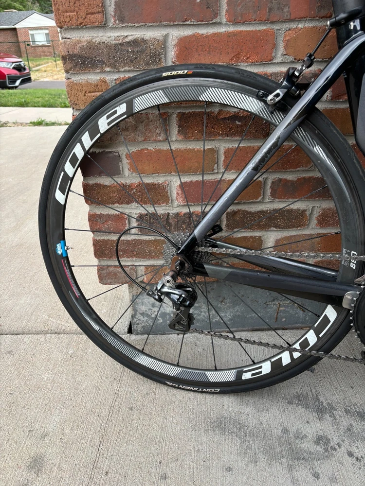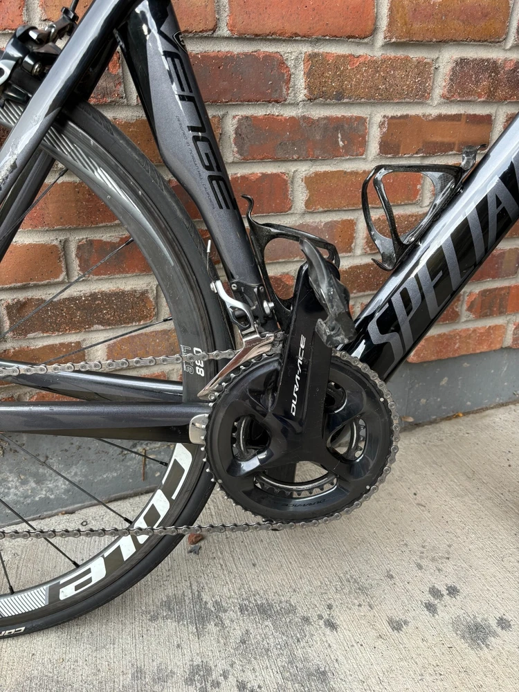 Specialized Venge with all the bells and whistles. Top of the line drive train, and 100 percent carbon. That's right, carbon wheels, carbon frame, carbon bars, carbon stem, even the derailleur is carbon. Nearing the UCI minimum weight, this bike is fast up the climbs, but has the stability and aero advantage making it and even faster on the way down. All professionally maintained. New chain with less than 30 miles on it. If you're still reading this, this is the bike for you. Send me a message. Specs: Full drive train including brakes: Shimano Dura-ace50/34 front, 28/11 cassette Frame: Specialized Venge Fact 10r carbon Wheels: COLE C38 Lite carbon wheel set with ceramic bearings Stem: Easton EC90SL carbon stem Bars: Easton carbon Aerobar AND brand new bar tape with Fizik bar gel for extra comfort.
