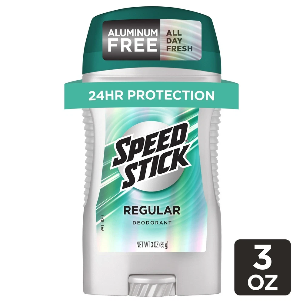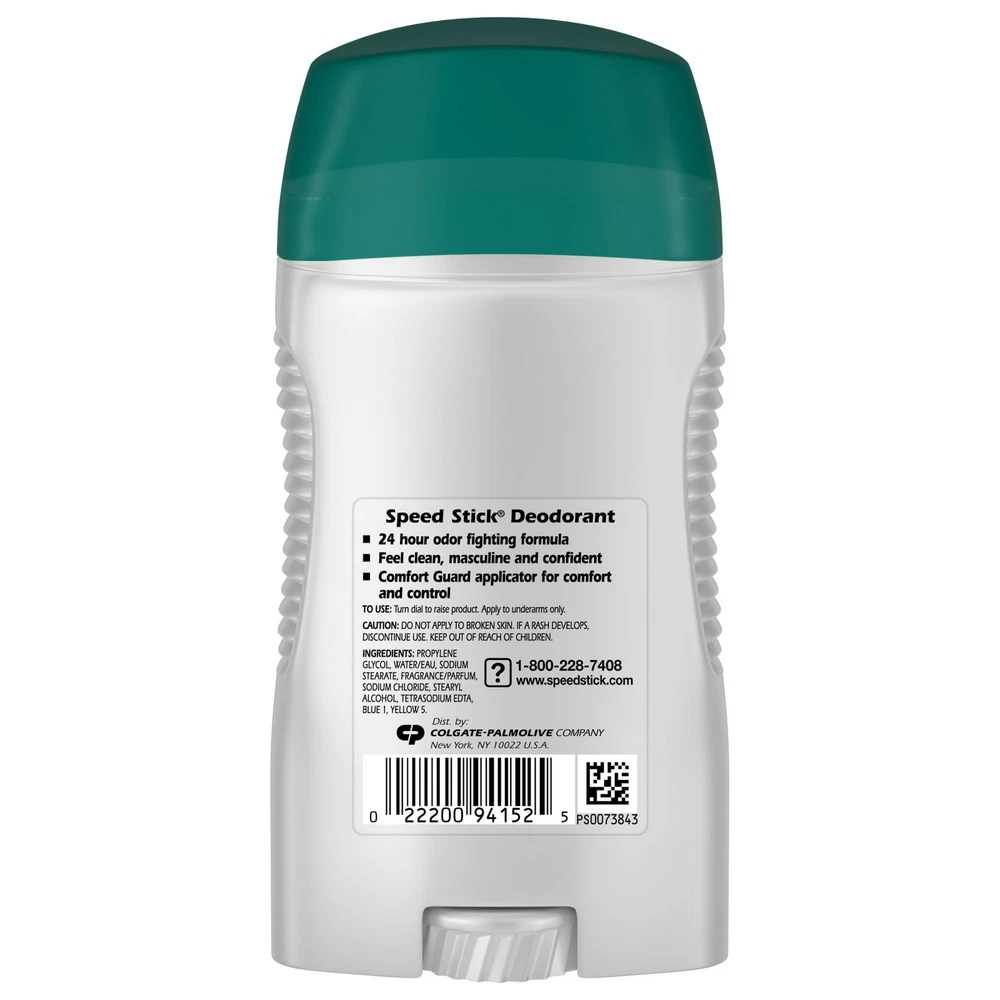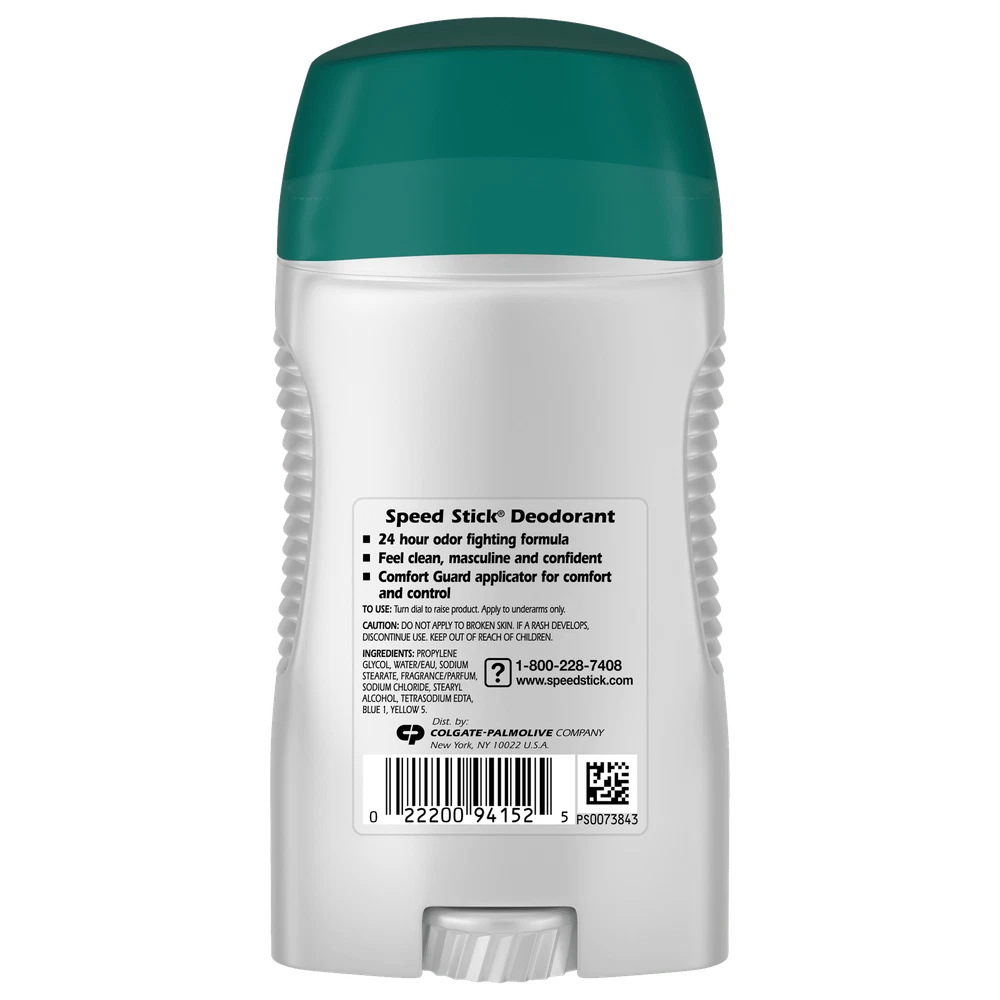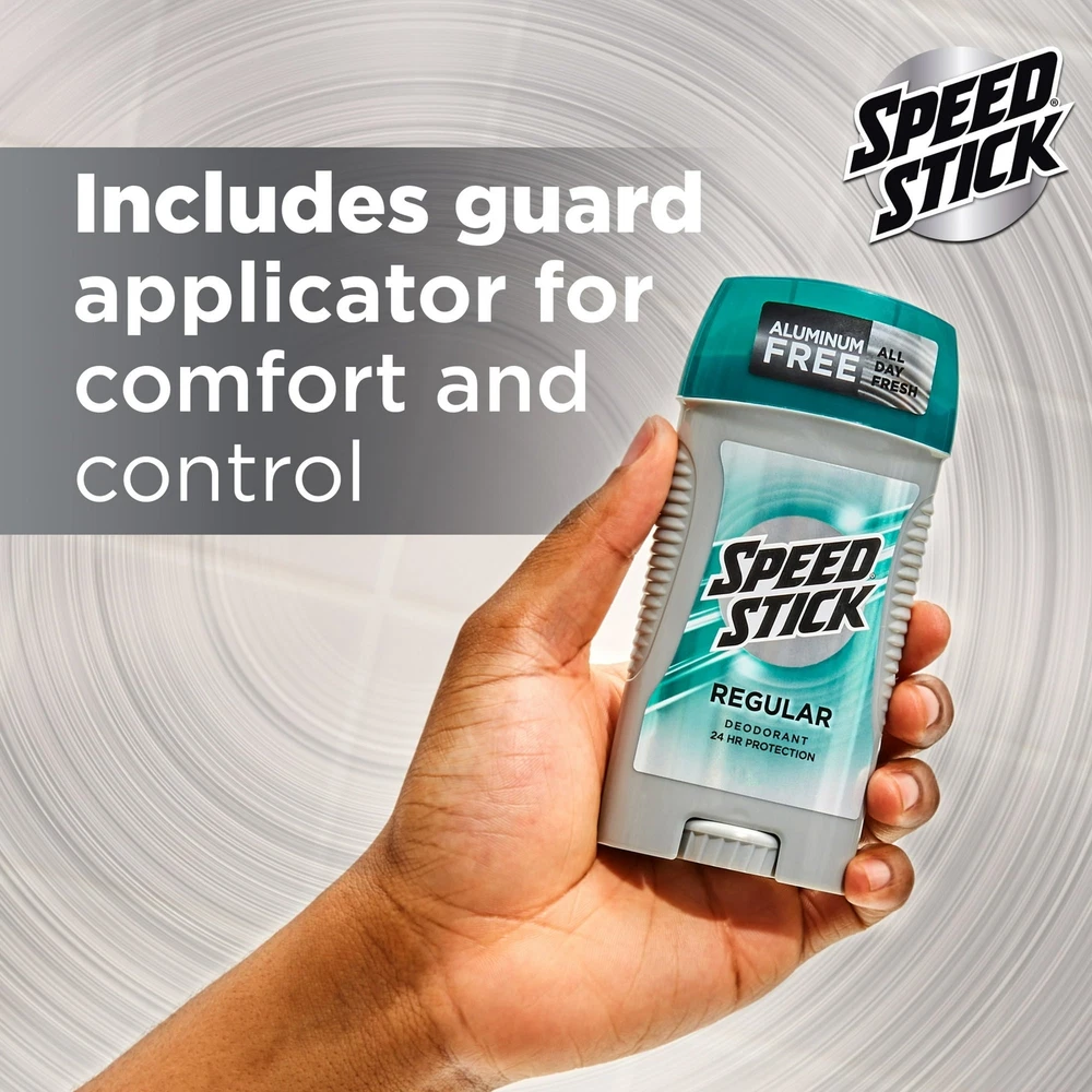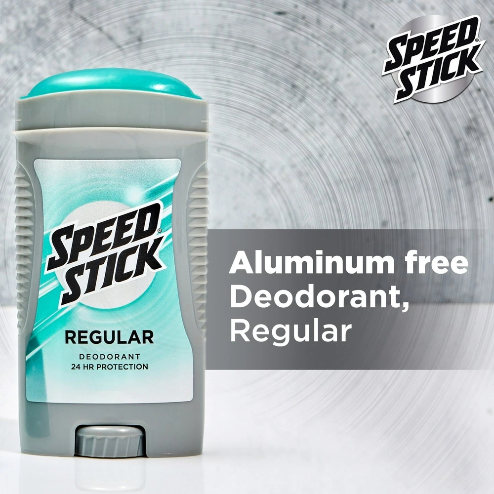 Product Description Speed Stick by Mennen Deodorant Regular Feel Clean and Confident 3oz (2 Pack) Feel clean, masculine and confident with Speed Stick Deodorant for Men, Regular scent. This odor-fighting formula provides 24 hour freshness for maximum confidence. This Speed Stick men’s deodorant includes a comfort guard applicator for comfort and control. This solid stick deodorant for men is aluminum free. The classic scent of Speed Stick Men’s Deodorant, Regular scent, will help you smell fresh and confident all day. Speed Stick Men’s Deodorant is aluminum free and provides all day freshness. With a 24 hour odor fighting formula, this deodorant for men will help you feel great and smell fresh all day. Feel confident to take on the day. Men's Deodorant with Odor Fighting Formula that Provides 24 Hour Freshness for maximum confidence Feel clean, masculine and confident Aluminum Free Includes guard applicator for comfort and control Feel clean, masculine and confident Regular scent Fresh scent Inactive Ingredients Propylene Glycol, Water/Eau, Sodium Stearate, Fragrance/Parfum, Sodium Chloride, Stearyl Alcohol, Tetrasodium EDTA, Blue 1, Yellow 5. Ingredients Propylene Glycol, Water/Eau, Sodium Stearate, Fragrance/Parfum, Sodium Chloride, Stearyl Alcohol, Tetrasodium EDTA, Blue 1, Yellow 5.