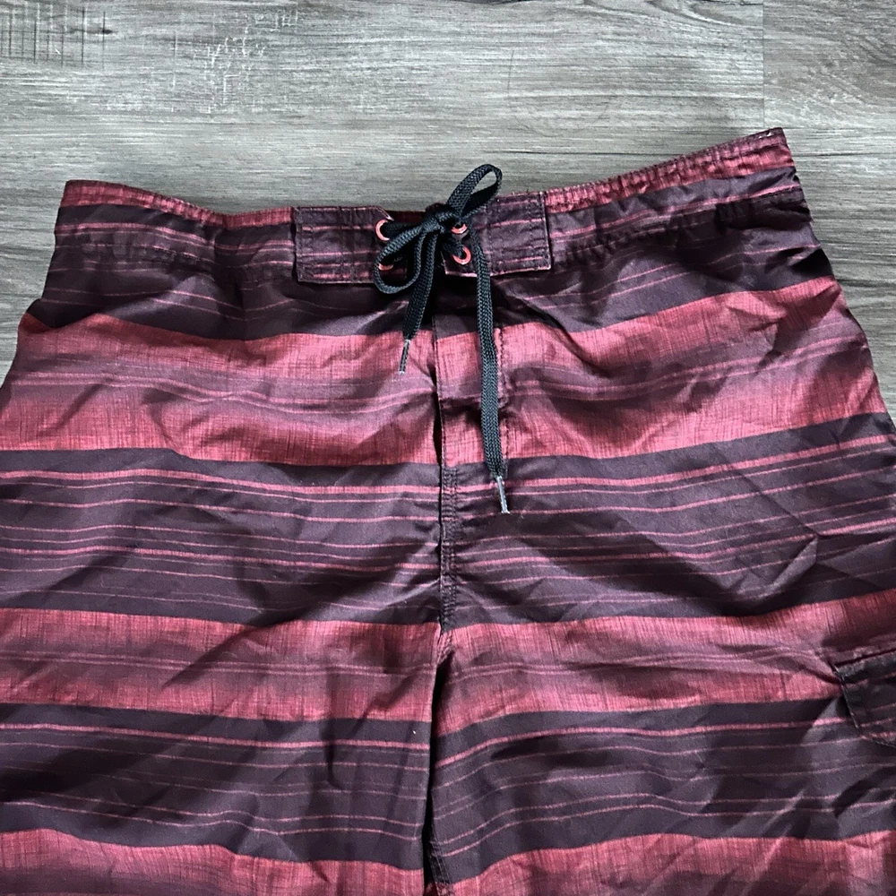Speedo Burgundy Stripe Swim Trunks Men Size XL. Speedo Burgundy Stripe Swim Trunks Men Size XL in great condition/ one cargo pocket / elastic waist with front tie - Please See All measurements Waist 17” across Length 22” Approximate measurements #17 Hawaii, pool party, beach, surf, luau