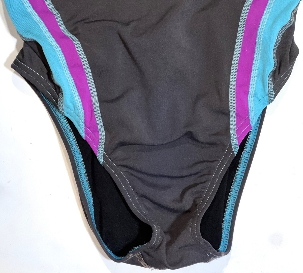 Speedo Race Quantum Splice Super Pro One-Piece Striped Colorblock Bathing Suit Swimsuit ~ Women's Size 30. Measures: 13" flat across the front from underarm to underarm unstretched and 23" from shoulder to crotch.