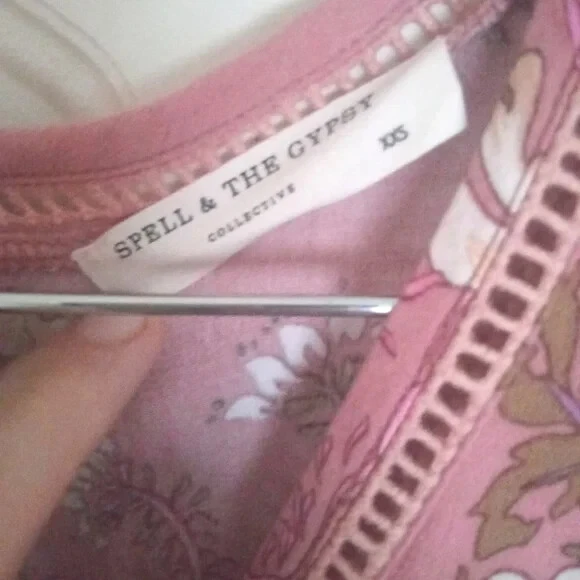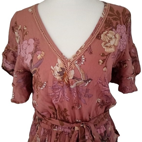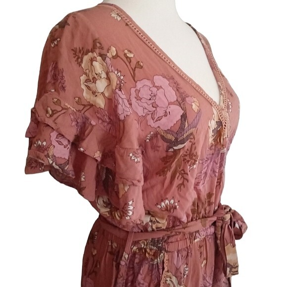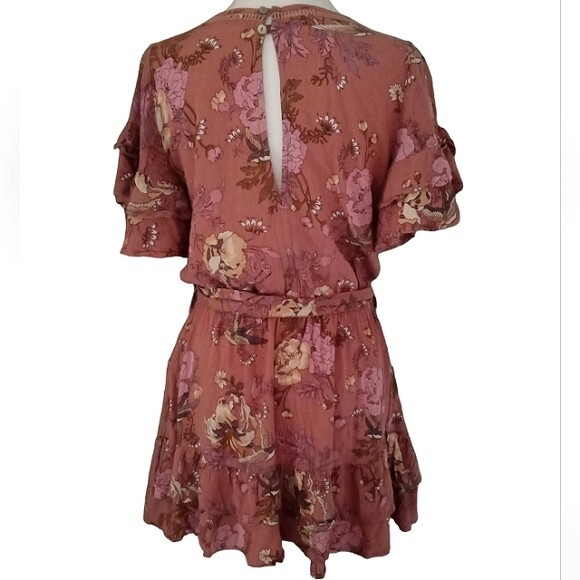 Rayon blend Hand wash cold Unlined Lattice trim and tiered ruffles Elasticized waist with tie detail Side slant pockets with lace trim Back keyhole with button closure Size XXS Excellent Pre Owned Condition Pit to Pit 15" Shoulder to Hem 28 1/2"