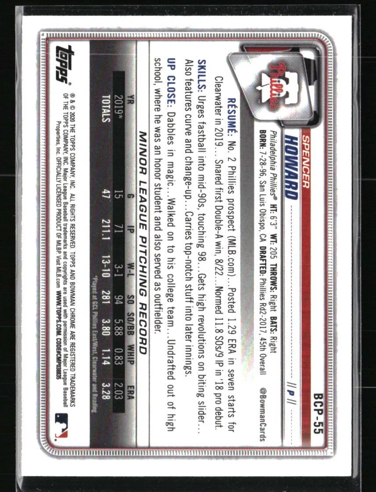 Set: Bowman 1st Edition Year Manufactured: 2020 Card Number: BFE-55 Team: Philadelphia Phillies Season: 2020 Manufacturer: Bowman 1st Edition Sport: Baseball Type: Sports Trading Card Player/Athlete: Spencer Howard League: MLB Graded: No