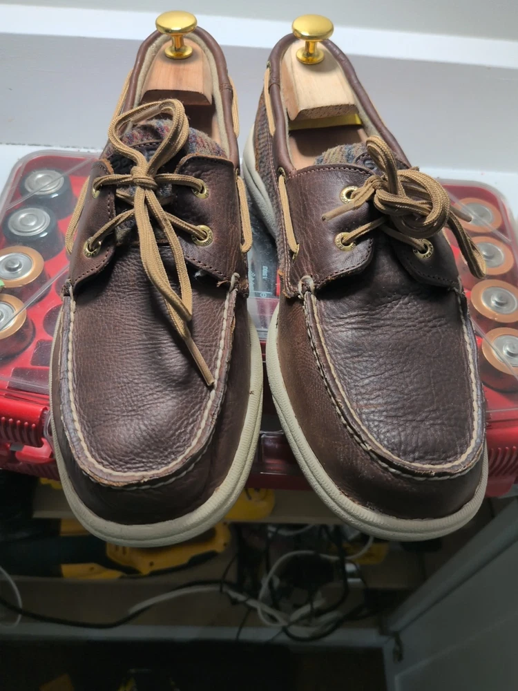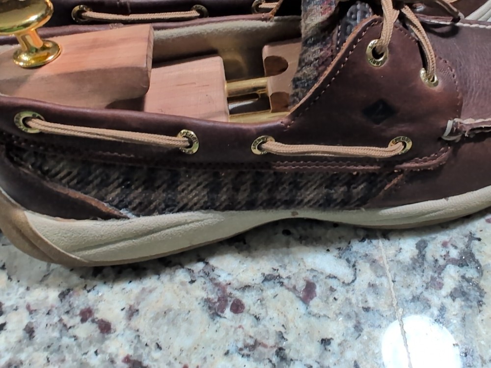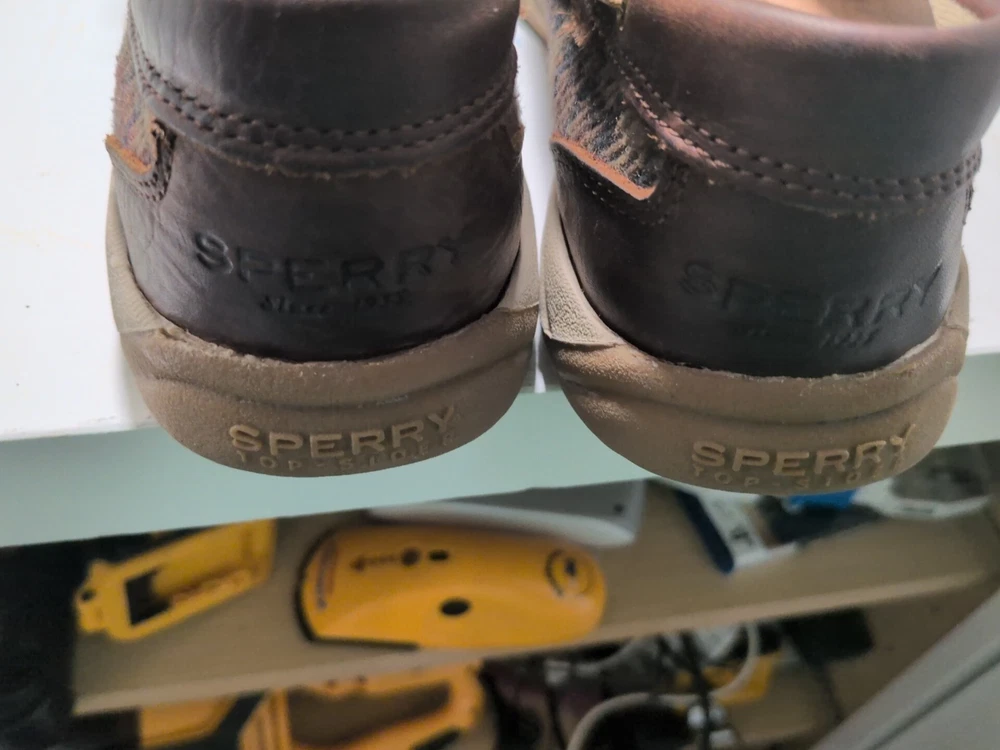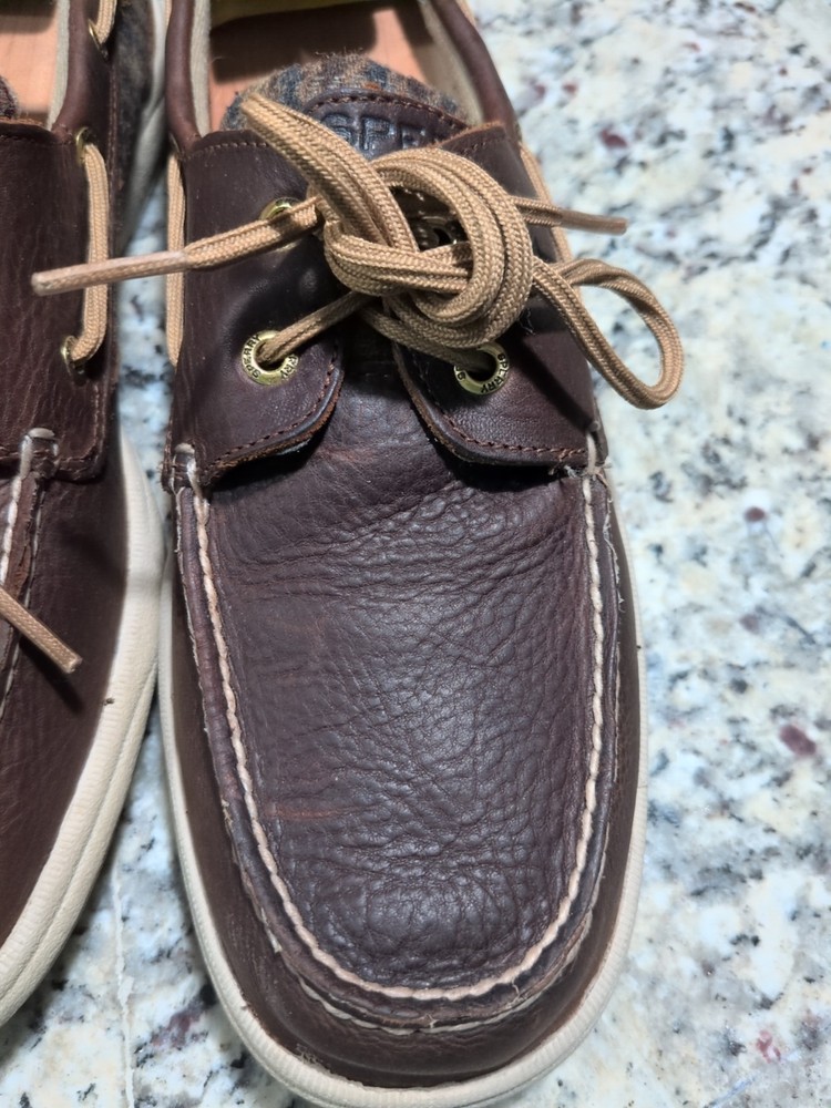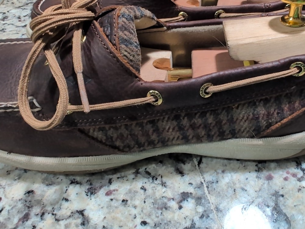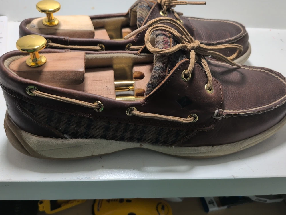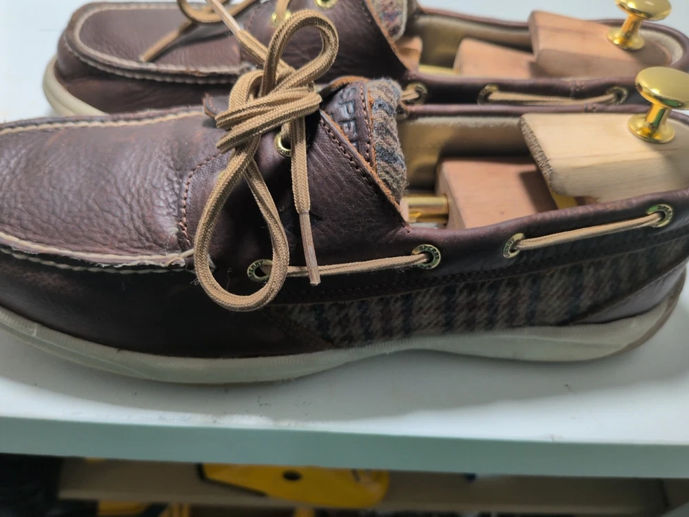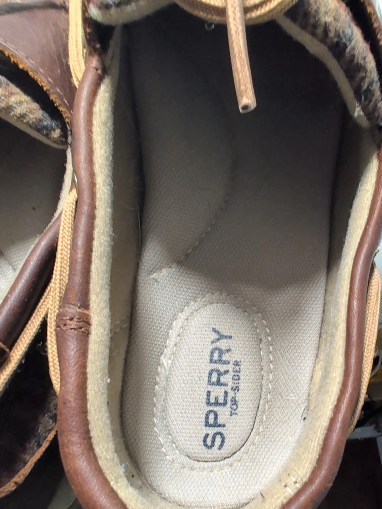 Sperry Topsider Women's Boat Shoes are perfect for a casual occasion and feature a brown leather and fabric upper material. The shoes have a medium width and a fabric lining and insole material. The outsole is also made of fabric. These boat shoes are part of the Sperry Top-Sider product line and are designed for women with a US shoe size of 11. Shoe trees not included