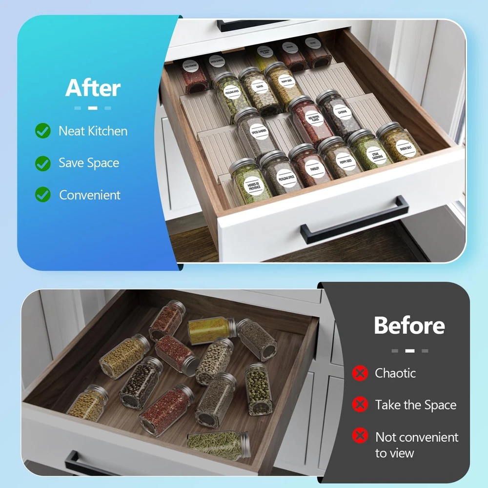 Spice Drawer Organizer, Spice Rack Drawer for Kitchen,4 Tier Clear Acrylic, Expandable From 13" to 26" Spice Rack Tray for Cabinet/Countertop(4 Pcs Clear) Product Details Color: Clear-4 Pcs Brand: SZWQILIN MPN: zc-1 UPC: 705735965616 EAN: 0705735965616 Material: Acrylic Color: Clear-4 Pcs Special Feature: Spice Drawer Organizer Product Dimensions: 13"D x 4.3"W x 1"H Shelf Type: Drawer Spice Rack Material: Acrylic Color: Clear-4 Pcs Special Feature: Spice Drawer Organizer Product Dimensions: 13"D x 4.3"W x 1"H Shelf Type: Drawer Spice Rack Number of Shelves: 4 Room Type: Kitchen Assembly Required: No Mounting Type: Tabletop Brand: SZWQILIN Is Customizable: No UPC: 705735965616 Manufacturer: SZWQILIN Part Number: zc-1 Item Weight: 14.4 ounces Item model number: zc-1 Special Features: Spice Drawer Organizer Batteries Included?: No Batteries Required?: No Date First Available: March 19, 2024 - Expandable design: The spice drawer organizer is designed to expand from 13" to 26", making it suitable for various drawer sizes and ensuring maximum storage capacity. Fits your drawers, cabinets or countertops,and can hold up to 64 standard 4-ounce spice jars. 4-tier organization: With four tiers, this spice rack drawer provides ample space to store and organize your spices, seasoning packets, and other kitchen essentials in a neat and accessible manner,The angled design opens the drawer and the labels of the spice bottles are visible at a glance Easy to clean: The smooth surface of the organizer allows for effortless cleaning. Simply wipe it with a damp cloth or wash it under running water for quick and convenient maintenance. Premium Materials: Made of high-quality acrylic material, this spice organizer is sturdy and built to last. It is resistant to scratches, cracks, and stains, ensuring long-term usability. Stylish and practical: The Clear acrylic and sleek design of this spice rack drawer organizer add a touch of elegance to any kitchen decor. It not only keeps your spices organized but also enhances the overall aesthetic appeal of your kitchen space. also good for organising nail polish, lipstick, perfume or some medicine bottles