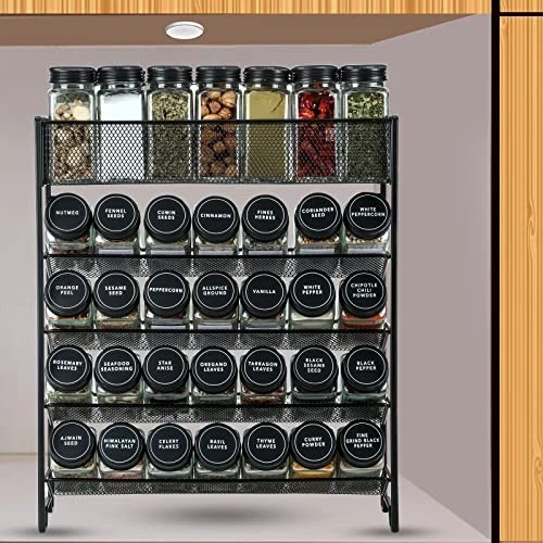 Return Policy Fast Delivery Trusted seller Spice Rack Organizer with 28 Spice Jars, Black Lids,Spice Labels, Chalk Marker and Funnel Set for Cabinet, Countertop, Pantry, Cupboard or Wall Mount Product Description Complete Spice Rack with Jars Set:5-tier spice rack organizer x1 , empty glass spice jars x28, plastic inner lids x28, black metal caps x28, waterproof spice jar labels set x1, silicone funnel x1, chalk marker x1. Spice rack measures 13"L x 4.7"W x 15"H. Each square spice jar measures 1.8"W x 4.1"H, 4 fluid oz capacity. 5 Tier Spice Rack - Made of strong steel and powder coatings electrostatic spray finished.Ideal sized spice rack organizer for cabinet, countertop, pantry, cupboard, door or wall mount. Inclined design make it easy to locate and quickly grab what you need, turn any mess of spice into an organized masterpiece . Premium Thick Glass Jars:Our Spice Jars are made of Lead-Free durable glass with transparent body,so that you can see the contents in the jars directly with what’s inside and how much left. The modern design square seasoning containers fit any spice rack, cabinet, organizer, drawers, or kitchen. Waterproof Spice Labels: Preprinted labels to help name ingredients on similar jars. The labels contain almost all the spices and food contents even leave some blank labels and a chalk pen for you to write exclusive spices. Risk-free Purchase - If you have any issue with our products, please don't hesitate to contact us, we will try our best to find a satisfactory solution for you within 24 hours. However, we are quite sure that you will be impressed with our well-crafted, durable and practically designed spice rack during your daily use. Shipping Returns Payment Shipping Shipping is FREE to all addresses other than APO/PO boxes in the lower 48 states. All our stock ships from US-based warehouses. Shipped via USPS or UPS (depending on location and package weight) Unless stated otherwise, all orders will ship within 24-72 hours of your payment being processed. Check our feedback to see the great reviews of FAST shipping we offer. Returns Seller does not accept returns Payment We currently accept payment via eBay managed payments only. Once payment is cleared, we will dispatch your shipment within 1-3 business days. Please refer to the "Shipping" tab for more information regarding shipping speed to your destination.