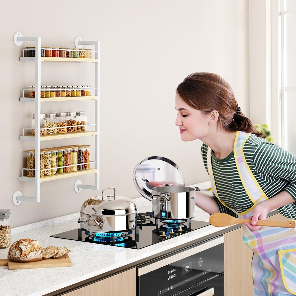 Spice Rack Wall Mount,4 Tier Hanging Seasoning Organizer,Spice Rack for Wall for up to 50 Jars,Spice Organization for Kitchen Cabinet,Living Room,Bathroom,Pantry,Natural TLJ016R LARGE CAPACITY: Each spice rack holds 80 4OZ seasoning jars,or 20 500ml seasoning jars, but also big bottles and cans.; use the wall-mounted spice rack to keep your spices perfectly organized and easily accessible at all times.The wall spice rack Size is 17.13"L x3.94"W x 29.13"H. WOODEN SPICE ORGANIZER: spice rack is made of 4 layers of chipboard and metal frame, with strong and stable structure and stylish appearance. The vintage look suits any room decor style and makes your kitchen or pantry look fabulous.Compared with most products on the market, our spice rack is more sturdy and durable with large capacity to meet your different needs. MULTIFUNCTIONAL SPICE STORAGE: Mount the spice rack on the wall or hang the spice organizer on the pantry or cabinet door. In the kitchen, it can organize your desired spice jars, tea bags, etc.; in the bathroom, you can use it to organize toiletries, cosmetics; in the living room, you can use it to organize snacks, medicine bottles; choose to place these space-saving kitchen spice racks according to your needs and keep your home and kitchen free from clutter. ROBUST AND RELIABILITY: Our spice racks have added side guards and bottom fixing discs to ensure safety and stability. The guards prevent spices from falling. Compared with most products on the market, our spice racks are more durable and have a large capacity to meet your different needs. EASY TO INSTALL: Our spice rack organizer is very easy to install. You just need to fix the product on the wall or door with the included screws. Detailed installation manual and installation tools are provided to help you complete the installation quickly. If you encounter any problems, please contact us and we will assist you to solve them.