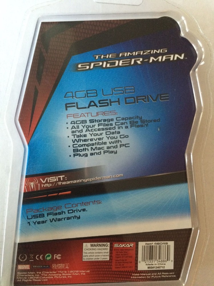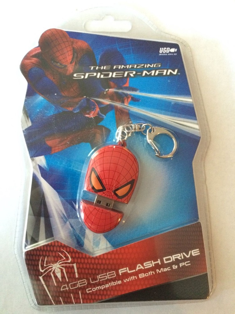Compatible with PC and Mac computers 4GB Storage Capacity Features plug and play capability Product Description Take your data wherever you go with the Amazing Spider Man 4GB USB Flash Drive. It is compatible with your PC and Mac computers and allows you to store and access all of your files in a flash! It is so easy; just plug and play!
