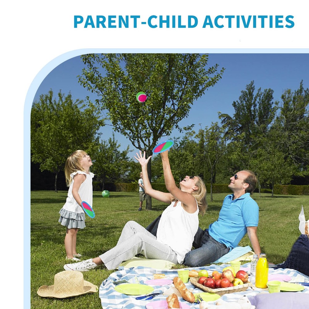 Catch more fun at the grass,Lawns, beach, lakeside ,and in park,farm,manor, forest,school.garden and ect with our mitts and balls,toss & grip helps exercise hand-eye cooperation so that keep body active and healthy state,our toss and catch ball set suitable for all ages from 3 years old. you can paly this catch toy for fun with family, friend, couple , classmates,have a storage bag,it is easy to carry, perfect for outdoor or indoor use. Playful Sticky Ball Catch Game: Our toss and catch ball set includes six blue paddles ,three balls ,one storage bag, It’s easy and fun,one side throws the ball and the other catches it with paddles,this ball catch game is meaningful for kids and adults to play toghther High-Quality Material : Our outdoor games for kids is made of high-quality plastic and nylon material, much firmer and not easy to damag,the thickened bottom gives the catchers mitt more cushion when catching the sticky ball,the tight stitching ensure the ball is pulled from the paddle board without damaging . Parent-child Interaction : Are you still frustrated that you are too busy to spend time with your kids? our catch ball game will help you very well which increased parent-child relationships in the interaction between throw the ball and catch the ball. It is not only a ball game, but also a bond of emotional connection between family members. Play Anywhere Any Time: Our sticks catcher game are suitable for the grass,Lawns, beach, lakeside ,park,farm, forest, woods, school.garden and ect , you can paly this catch toy for fun with family, friend, couple and classmates,this kids outdoor games is also prefect for kid’s parties ,picnic parties, camp trips,summer travel, winter travel and other outdoor activities. It Is Good Exercise for Kid’s Physical Fitness: Are you worried that your kids are intoxicated with rechargeable products? our ball toss game can help you, this paddle game will exercise kid’s hand-eye cooperation so that children can keep active and healthy state,this ball game need at least 2 players,this is a great throw and catch toy to promote interaction between family.