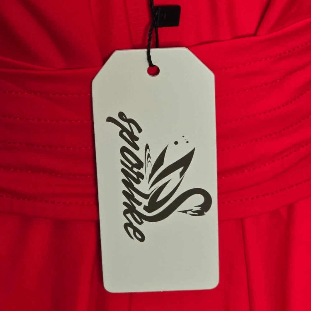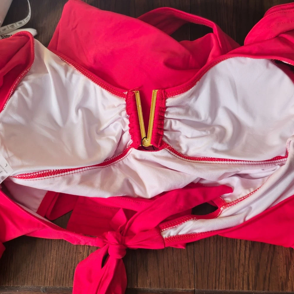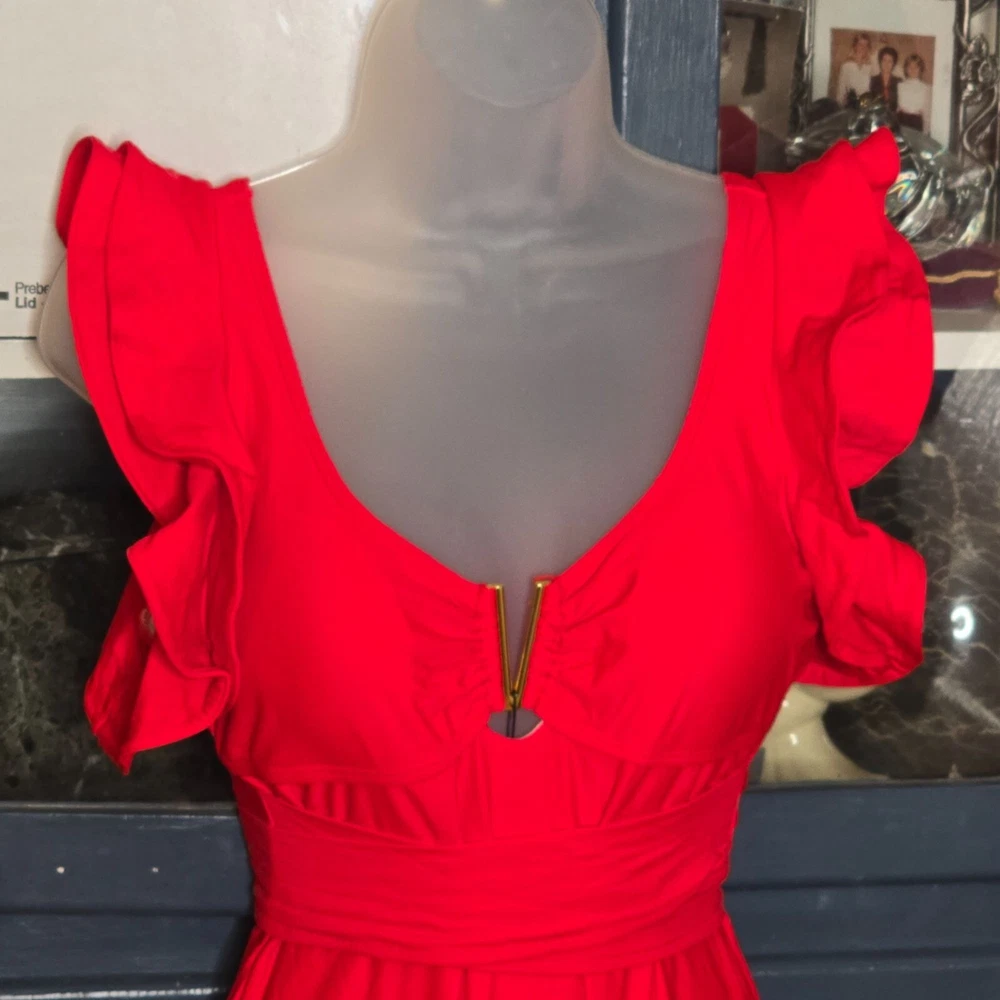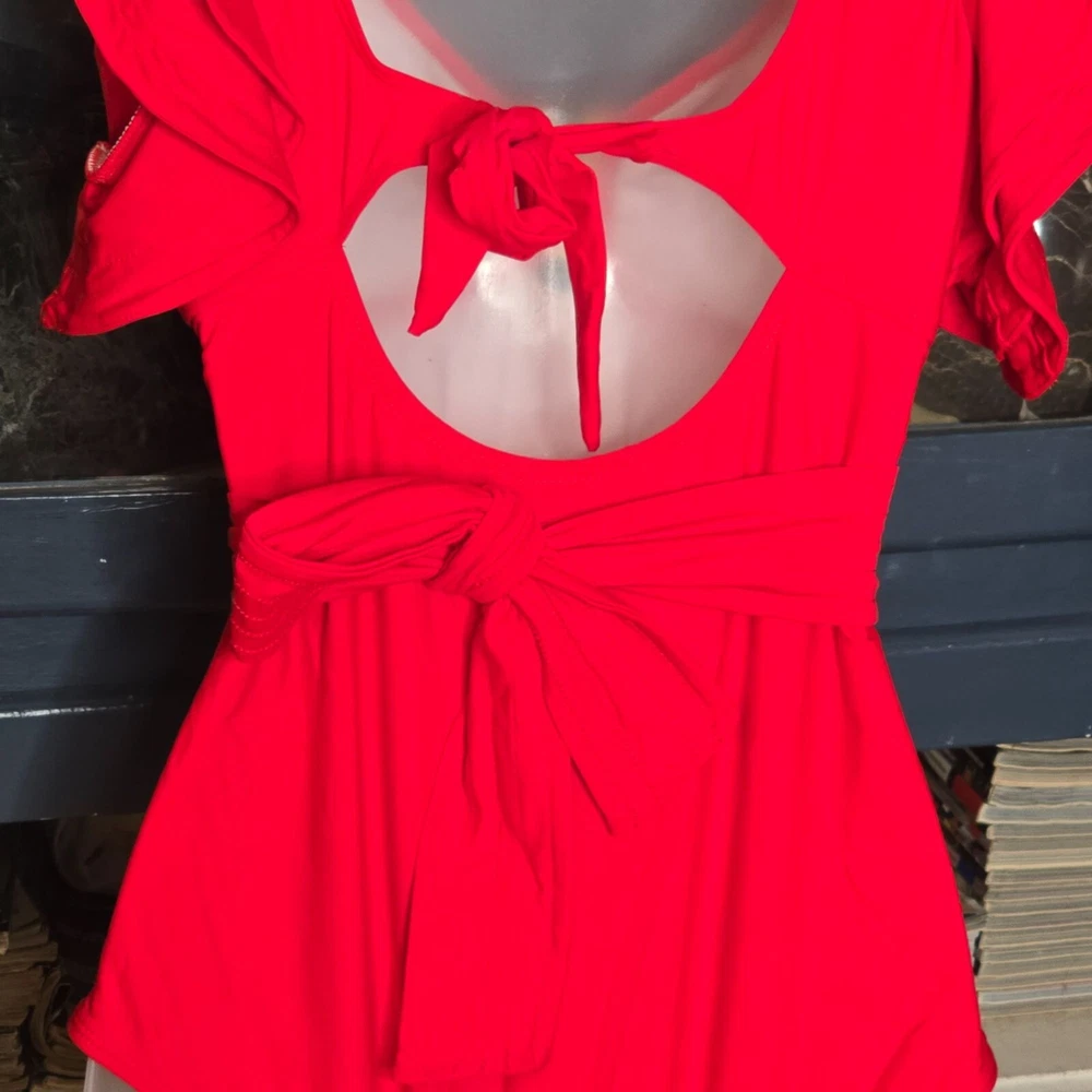 This swimsuit features a vibrant red hue with a sophisticated V-neckline and elegant ruffle sleeves. A stylish cut-out back design is tied with a bow, adding a touch of flair. Suitable for beach outings and poolside relaxation, it offers a blend of comfort and style. • V-neckline with gold accent • Ruffle sleeves • Cut-out back with tie closure • Stretchy and comfortable fit Features: • Gold Metal V Accent • Tummy Tuck Swimsuit • Figure Flattering • Lined, Built in Bra w/ Removable Cups Size: Womens Large Measurements: Across Chest 16 in / 41 cm Across Waist 15 in / 38 cm Across Hips 17 in / 43 cm Total Length 28 in / 71 cm Condition: New With Tags NWT No Smoking Workspace Please review all photos closely before purchase, buy responsibly, thank you. Please read the description for further details and measurements, Thank you!