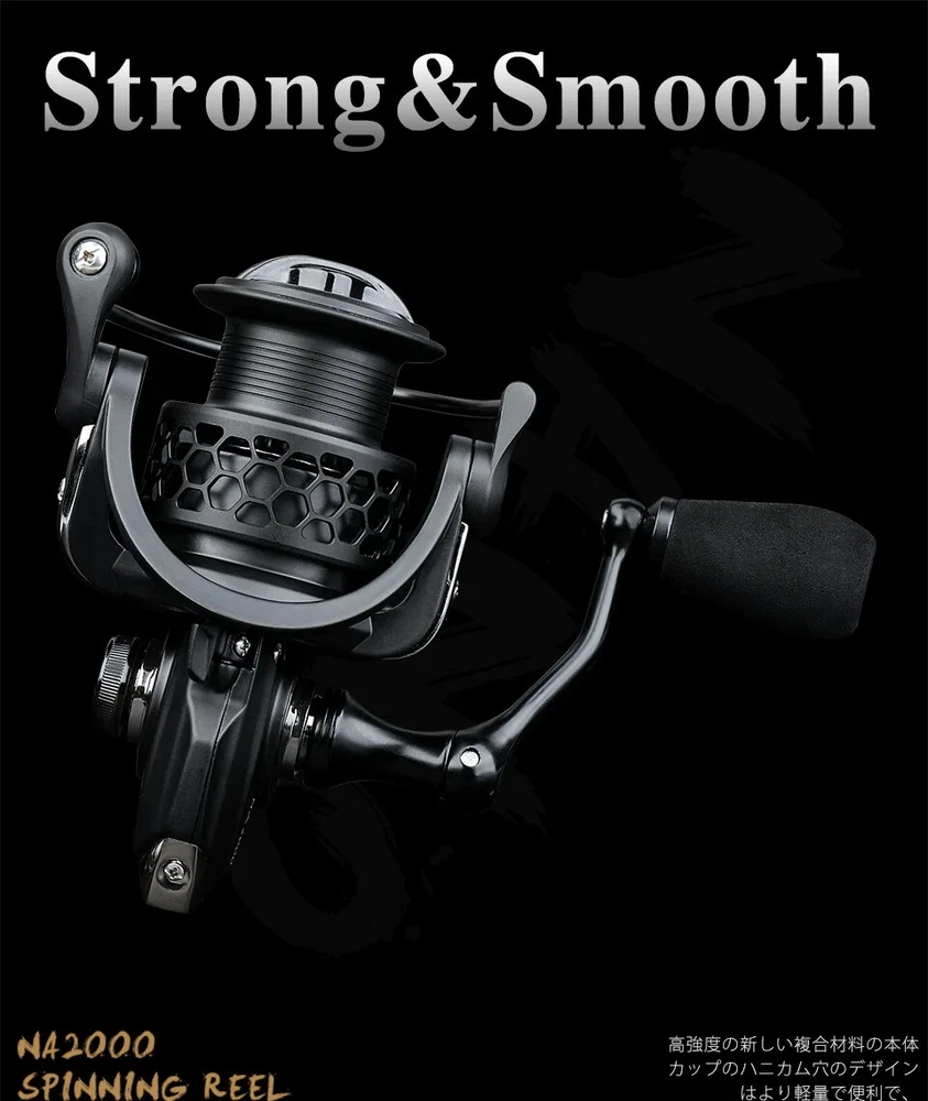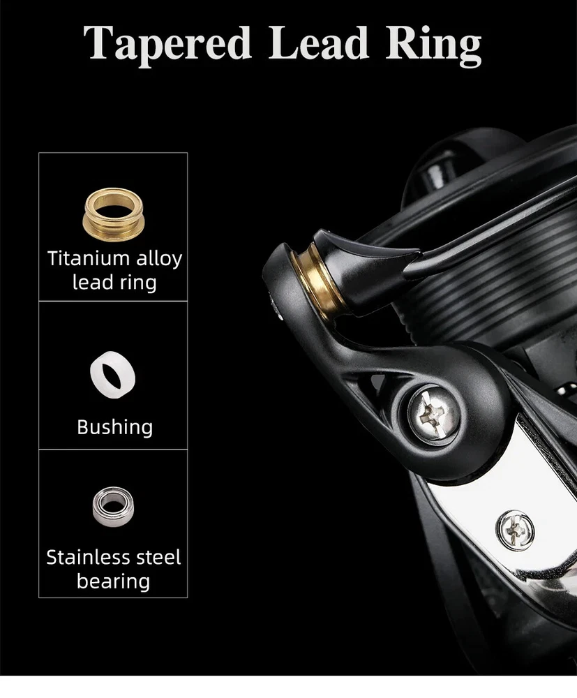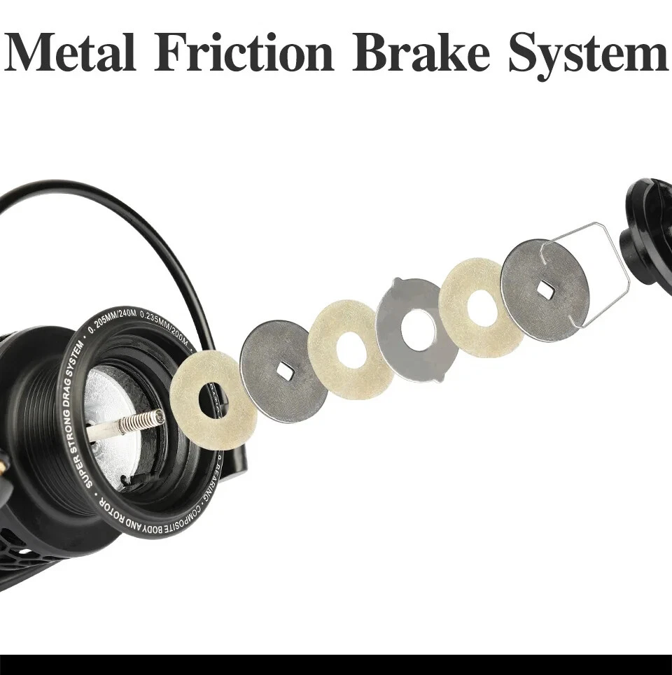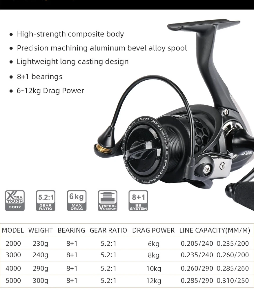 Super strong composite body and rotor. Dual propulsion ant-twist line roller. CNC machined aluminum spool. 8+1 ball bearings CNC machined aluminum handle+rubber handle knob. Max Drag: 12KG | Line Capacity(mm-M): 0.285/260
