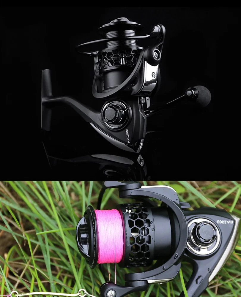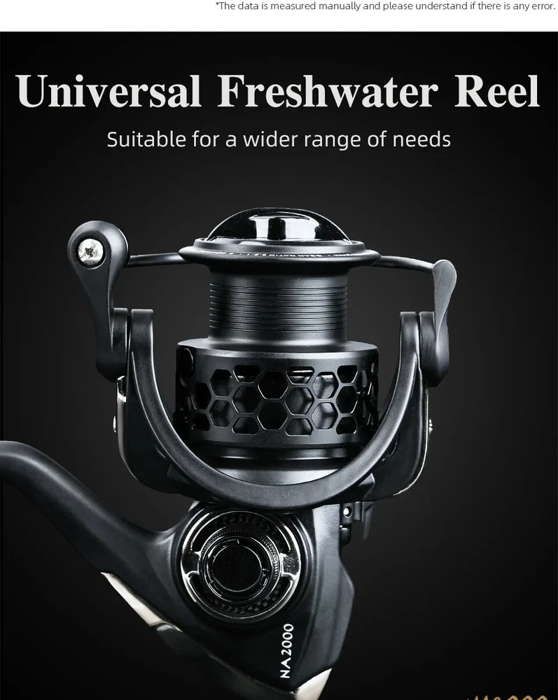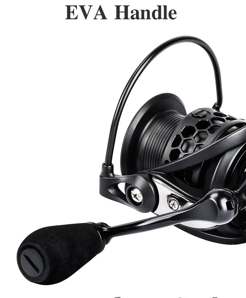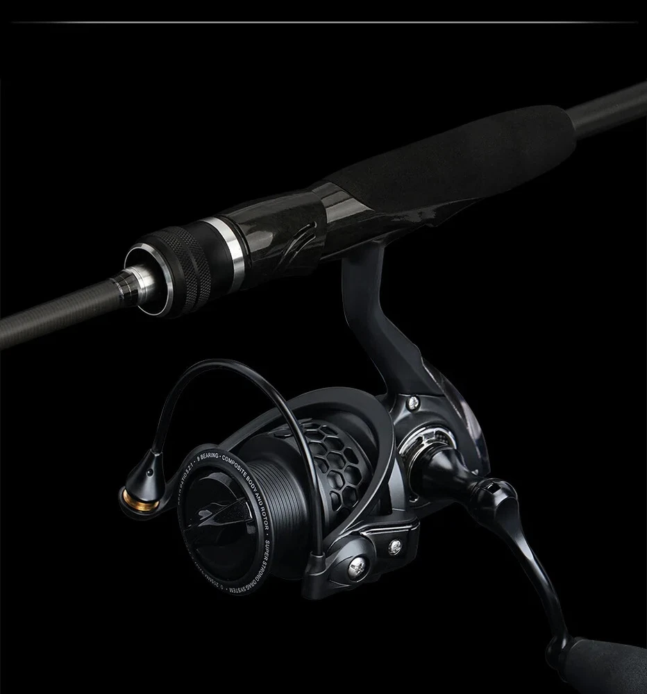 Super strong composite body and rotor. Dual propulsion ant-twist line roller. CNC machined aluminum spool. 8+1 ball bearings CNC machined aluminum handle+rubber handle knob. Max Drag: 12KG | Line Capacity(mm-M): 0.285/260