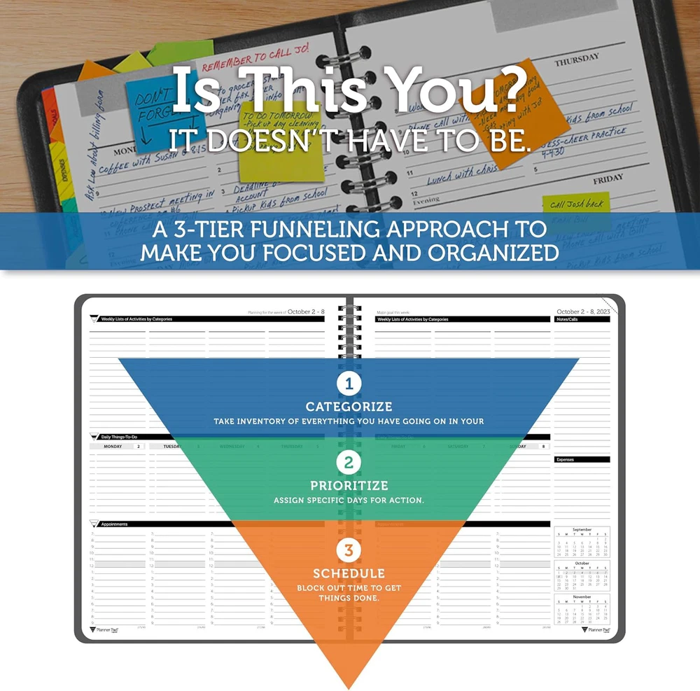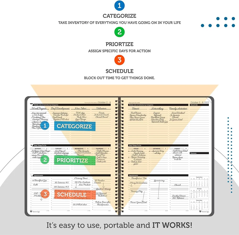 Fast Shipping Great Customer Support Satisfaction Guaranteed DESCRIPTION Shipping Shipping Shipping All domestic packages are shipped for Free (Unless other shipping method was selected during the checkout) Most items ship and arrive much sooner than the estimate delivery date. Usually within 2-3 days from payment. However, we have longer estimates to compensate for the occasional delay or supply chain breakdown. We do not accept P.O. BOXES - PLEASE PROVIDE A PHYSICAL ADDRESS Return Return Return In the event that you would like to return your purchase, we allow returns that are processed within the defined return date (the return date is to be found in the return policy/shipping and handling section) Please contact us for a return authorization and the return shipping address. Payment Payment Payment PayPal is our preferred method of payments it's the quickest, easiest and most secure way to pay for your goods or services online. PayPal offers buyer and seller protection should there be a problem. If you do not have a PayPal account, to get started and buy your first item with us is very easy. Simply click on the 'Buy It Now' button and follow the eBay checkout steps. Select PayPal as the payment method you then will be given the chance to enter your card details in to PayPal's secure checkout in order to pay for your order. Once the payment has been made, you will then be given the opportunity to make your own PayPal account to make paying for your items in the future very easy. Should there be a problem with payment please do let us know. Feedback Feedback Feedback Customer satisfaction is very important to us. If you have any problem with your order,please contact us and we will do our best to make you satisfied, please do not leave a negative feedback before we resolve your problem. We guarantee that your issue will be solved quickly. As long as you are happy with your purchase of , please leave us a positive feedback. Your feedback is very important to us it affects our search placement on eBay. We will leave a positive feedback for you in return automatically once we receive your feedback. Contact Us Contact Us Contact Us If you have any queries, please contact us via ebay. We usually respond within 24 hours on weekdays. Thank you for visiting our ebay store! EXCLUSIVE 3-TIER FUNNEL DOWN approach helps you prioritize and organize all that matters. Section 1- CATEGORIZE is to inventory everything you have going on. Section 2 - PRIORITIZE items from section 1 to specific days for attention. Section 3 - SCHEDULE is to block out time for tasks from section 2 THE 7 DAY WEEKLY VIEW with the Planner Pad organizer allows you to see the big picture of all that you are facing each week. Each day the funneling system channels your attention to the tasks that must be done. You will be more focused and organized in 30 DAYS GUARANTEED or Money Back THE SLIM PROFILE of the spiral bound organizer lies flat for ease of writing and daily updating. The classic business cover is both durable and attractive and works well on your desk or on the go. THE PREMUIM WHITE PAPER STOCK provides superior ink bleed through protection making your planning experience much more enjoyable. The black ink lines and grey accents in the weekly planner makes it easy on your eyes THE 12 MONTH Planner Pad planning system starts October 2023 and continues thru September 2024. Also includes 3 years of planning calendars - each a 2 page spread ideal for blocking out future events. By the first month's end, we GUARANTEE YOUR LIFE WILL BE MORE FOCUSED AND ORGANIZED Spiral Bound 3-Tier 12 Month Planner Organizer Oct 2023-Sept 2024 Black 8.5"x11" Click here to see description Fast Shipping Great Customer Support Satisfaction Guaranteed DESCRIPTION Shipping All domestic packages are shipped for Free (Unless other shipping method was selected during the checkout) We ship within two business days of payment, usually sooner Standard FREE shipping takes between 3-5 business days Expedited shipping takes between 2-3 business days Overnight shipping takes between 1-2 business days We do not accept P.O. BOXES - PLEASE PROVIDE A PHYSICAL ADDRESS We Ship Globally using ebay's GSP, the item is sent to a logistic center in KY and shipped from there to the rest of the world. International customers are responsible for all duties and taxes Contact your local authority for questions related to the amount of duties or taxes you will be responsible for Return In the event that you would like to return your purchase, we allow returns that are processed within the defined return date (the return date is to be found in the return policy/shipping and handling section) Please contact us for a return authorization and the return shipping address. Please contact us for a Return Merchandise Authorization (RMA) number. We advise you to use a reputable carrier service when returning your goods. Please pack all returns appropriately. We ship globally Via eBay's global shipping program (GSP). Thus we don't cover returns for items shipped globally. Buyers returning such items will be refunded ONLY for the item's cost and not for the shipping. please check the Voltage information and make sure it matches the one in your country. In case it's not stated in the description, do ask us. Payment PayPal is our preferred method of payments it's the quickest, easiest and most secure way to pay for your goods or services online. PayPal offers buyer and seller protection should there be a problem. If you do not have a PayPal account, to get started and buy your first item with us is very easy. Simply click on the 'Buy It Now' button and follow the eBay checkout steps. Select PayPal as the payment method you then will be given the chance to enter your card details in to PayPal's secure checkout in order to pay for your order. Once the payment has been made, you will then be given the opportunity to make your own PayPal account to make paying for your items in the future