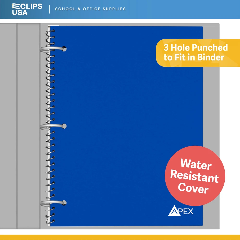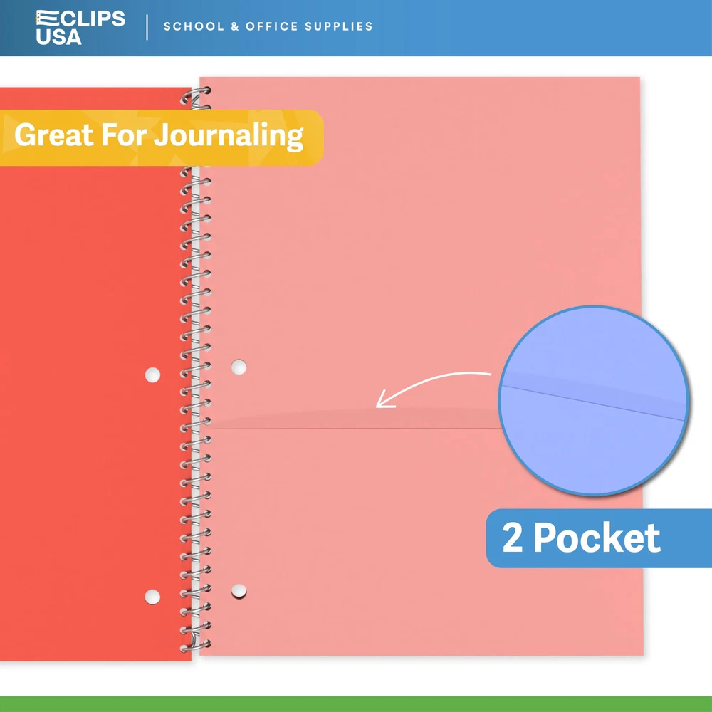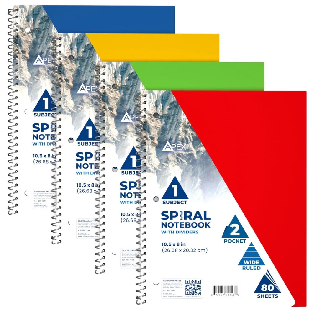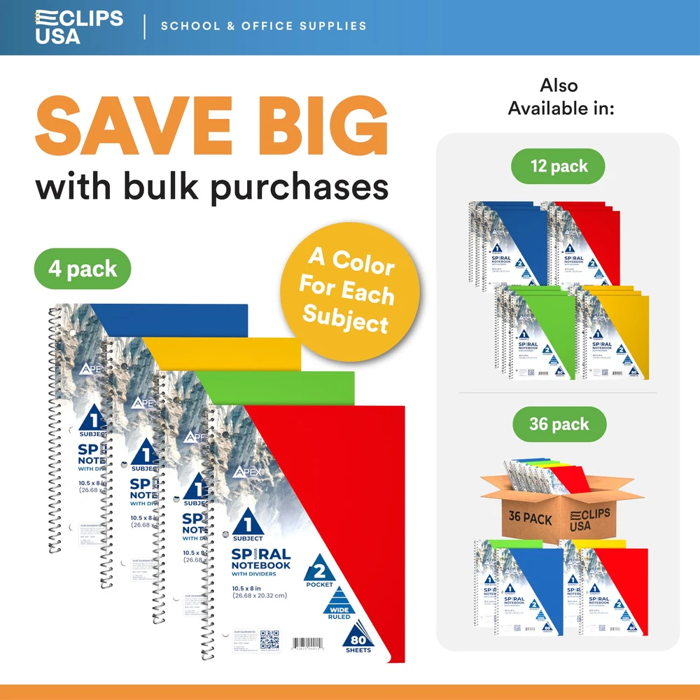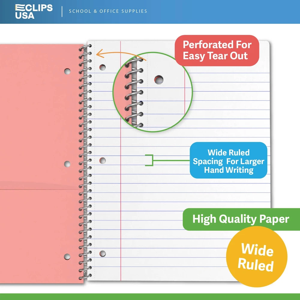 Spiral Notebooks (36 Pack) Single Subject Spiral Notebook Wide Ruled Personal and School Approved Use Dimensions 8″ x 10.5″ 2 Pocket storage 80 sheets Poly protective water resisant cover Spiral binding 3 holed (For binders) High tech micro perforation (for easy tear off) Wide ruled 4 Assorted colors (Use a color for each subject) Blue ink with red ink margin lines High quality high bright paper Whether you're using these single subject notebooks bulk for school, home, or professional use, the right quality supplies can make all the difference when it comes to note books. That’s why we put together this high quality notebooks bulk set. HIGH QUALITY SPIRAL NOTEBOOKS - 80 Sheets per spiral notebook. Strong steel wire notebooks. 3 Hole punched sheets for binders. GREAT FOR SCHOOL OR OFFICES - Spiral notebook wide ruled have the perfect line spacing for those with larging writing.Poly protective water resisant cover. BULK VALUE - Get your wide ruled spiral notebooks in bulk at the perfect value. Vibrant color spiral notebook 8 x 10.5, a color for each subject. PERFECT FOR YOUR OFFICE & JOURNAL WRITING - Wide ruled notebooks are perfect for record keeping or journal writing. 2 Pockets storage for organizing your papers. STURDY AND DURABLE - Lightweight sturdy and durable spiral notebooks wide ruled. Easy to tear pages, ink does not bleed through. WATER RESISTANT POLY COVER - Our poly cover 1 subject spiral notebooks have strong durable water resistant polyurethane covers. They are built to last and made easy to clean off spills and drips protecting your notes.