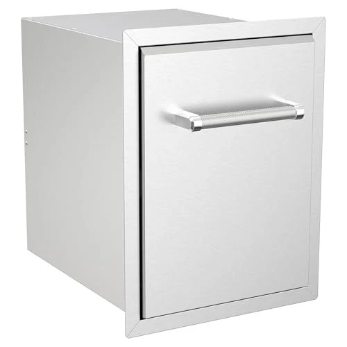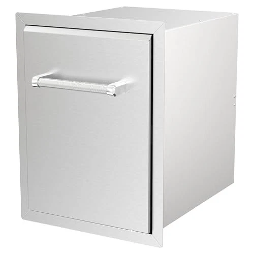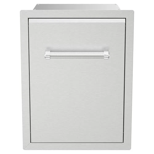 Elevate your outdoor cooking experience by adding the Roll-Out Trash Can to your custom island. Featuring a premium 304 stainless steel construction, this built-in component combines durability and style, ensuring it withstands the elements while maintaining its sleek appearance. The convenient roll-out design allows for easy access, making cleanup easier than ever. With just a simple pull on the ergonomic textured handle, you can reveal a massive 10-gallon trash bin. This spacious trash bin is designed to hold plenty of waste, ensuring that your outdoor kitchen remains spotless and organized. The combination of functionality and aesthetic appeal makes this roll-out trash can an essential addition to any outdoor cooking space. Say goodbye to clutter and mess; with the Roll-Out Trash Can, disposing of trash is effortless and efficient. Whether you're hosting a barbecue, entertaining friends, or simply enjoying a quiet evening outdoors, this trash can will seamlessly blend into your custom kitchen design while providing the convenience you need. Enjoy a cleaner, more enjoyable outdoor cooking experience today! Dimensions: Measures 13.83 inches wide, 23.89 inches high, and 19.5 inches deep, offering a compact yet spacious design. These dimensions make it ideal for integration into outdoor kitchens or islands without taking up excessive space Trash Bin Included: Comes with a 10-gallon (38L) black trash bin, providing a convenient and hygienic solution for managing waste in your outdoor kitchen setup. The bin fits perfectly within the unit, making disposal easy and efficient Handles: Equipped with heavy-duty, textured handles designed for durability and ease of use. The textured finish provides a secure, comfortable grip, ensuring smooth operation even in outdoor conditions Material: Constructed from 304 stainless steel, known for its excellent resistance to rust, corrosion, and wear. This high-quality material ensures long-term durability and maintains a polished, clean appearance despite exposure to outdoor elements Easy Access for Disposal: Designed for effortless access, allowing you to quickly and easily throw trash away without hassle. The top-opening design ensures that you can dispose of waste efficiently while cooking or entertaining outdoors Mounting: Designed with a universal mounting system, making it easy to install in custom outdoor kitchens or islands. This allows for flexibility and seamless integration into various design configurations