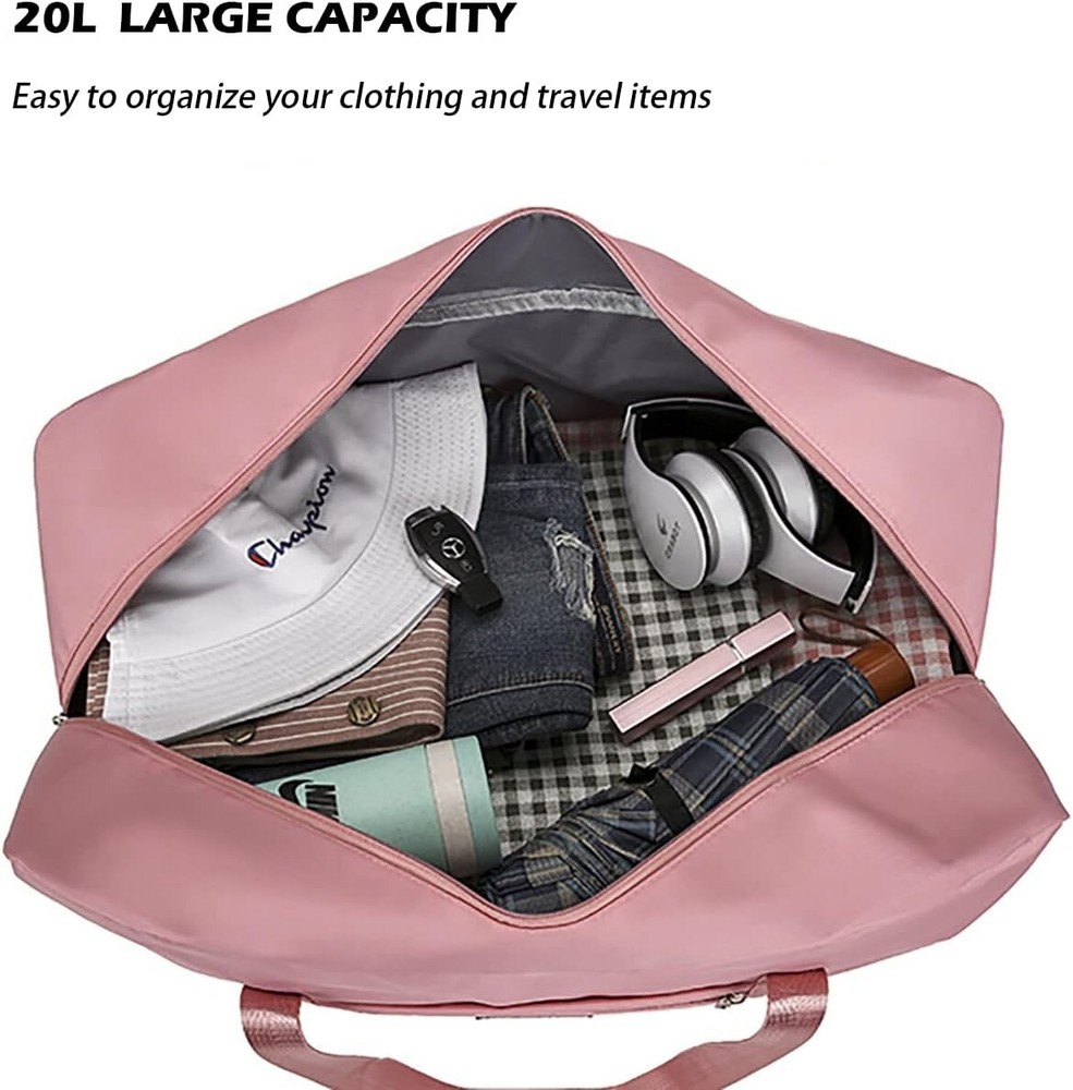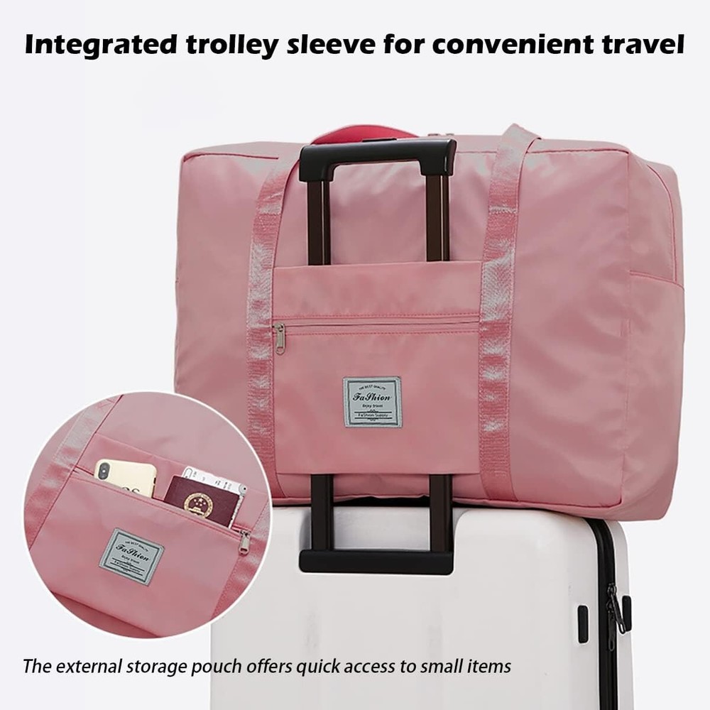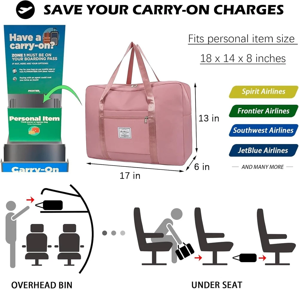 Travel Duffel Bag, for Spirit Airlines Personal Item Bag 18x14x8 Frontier Airlines Carry on Luggage Bag, Weekender Bag for Women and Men (A-Pink) 【Save Your Carry-on Charges】 Our carry on bag measures 17 x 13 x 6 inches and fits personal item size 18 x 14 x 8 inches of Spirit Airlines & Frontier Airlines perfectly. It can be placed under seat to save your overweight charges. 【Easy Carrying】 The integrated trolley sleeve slides over the rolling luggage handle making carrying a breeze. Your ideal travel boarding bag for business or personal travel. 【Large Capacity Weekender Bag】 Large storage space makes it easy to organize your clothing and travel items. Its external storage pouch offers quick access to small items. 【Water-Resistant and Durable Duffel Bag】 This duffel bag is made of high-quality polyester oxford fabric which is water-resistant and durable. Tight stitching, reliable zippers and sturdy carrying handle, every detail is delicately made, giving you a high-quality using experience, no need to worry any tearing or break during trips. Ideal for long-term use. 【Multi-purpose Travel bag】 This carry-on tote bag is a perfect reliable companion for travel and gym. It is a great as travel duffel bag, weekender bag, overnight bag, gym bag, yoga bag, workout bag etc.