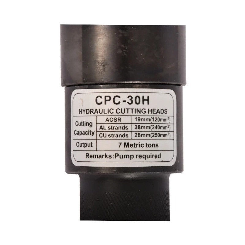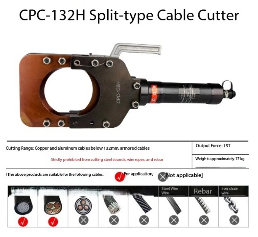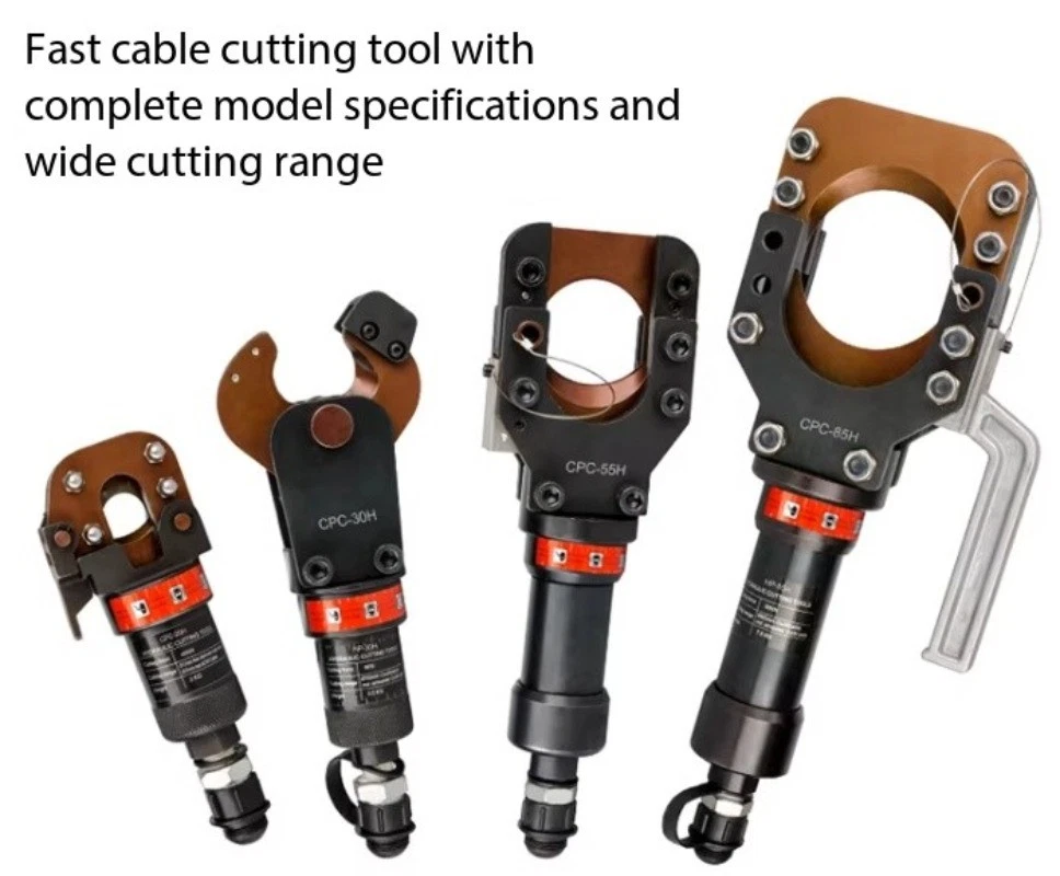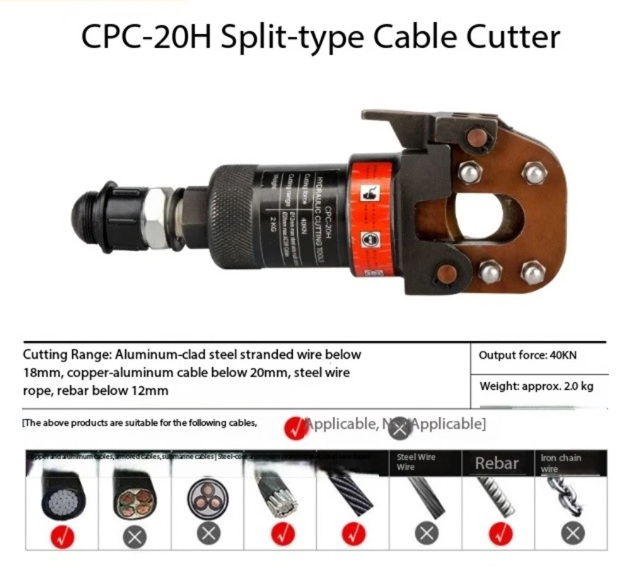 Split-Type Hydraulic Cable Cutter Hydraulic Cable Shears Electric-Hydraulic Cable Cutter Detachable Hydraulic Shears CPC-30H Split-Type Cable Cutter CPC-30H Cutting Range: Copper/aluminum cables under φ30mm, armored cables Strictly prohibited from cutting steel strands, steel ropes, or threaded steel bars Cutting Force: 6 kN Weight: Approx. 3.5 kg CPC-20H Split-Type Cable Cutter Cutting Range: Steel-core aluminum stranded wire ≤φ18mm, copper/aluminum cable ≤φ20mm, steel wire rope, rebar ≤φ12mm Cutting Force: 40 kN Weight: Approx. 2.0 kg