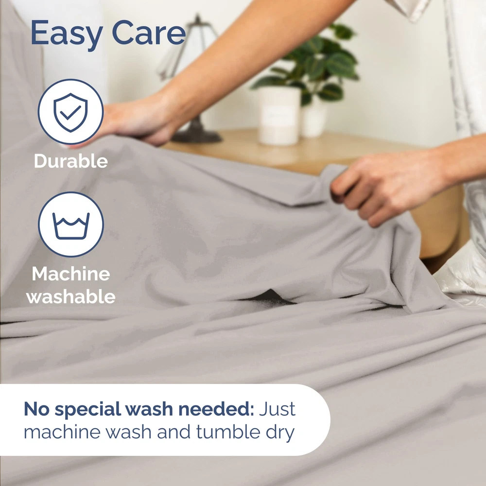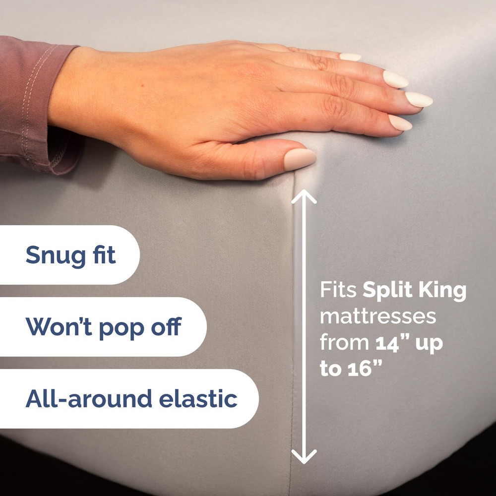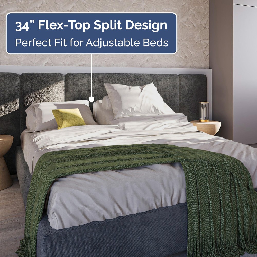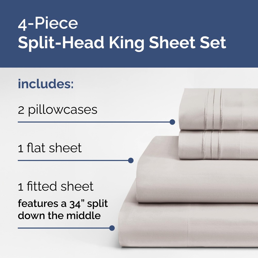 Enhance your sleep with our 4-Piece Split Head King Sheet Set, specially designed for top split King mattresses measuring 78” x 80”. This set includes 2 pillowcases (20” x 30”), a flat sheet (102” x 108”), and a fitted sheet (78” x 80”) with a 34” split at the top center, allowing each sleeper to adjust their side for personalized comfort. Made from ultra-soft, durable fabric, these sheets combine a luxurious feel with long-lasting quality, resisting fading and maintaining their smooth texture and vibrant color even after multiple washes. Designed with deep pockets to fit mattresses 14 to 16 inches deep, they stay snugly in place all night. Breathable and moisture-wicking, these sheets keep you cool and comfortable for restful sleep. Certified to meet OEKO-TEX STANDARD 100, they are safe, family-friendly, and free from harmful substances. Perfect for adjustable beds, this flex top King sheet set delivers elegance, functionality, and unmatched comfort. SPLIT HEAD KING SHEET 78 X 80: These ultra-soft sheets are designed for top split King mattresses, allowing each sleeper to adjust their side for optimal comfort. Unlike sheets for mattresses split straight down the middle, our split head King sheets are perfectly tailored for top split head King mattresses, offering superior comfort and breathability to keep you cool all night long. 4 PIECE SPLIT KING HEAD SHEETS SET: Elevate your bedroom with our flex top King sheets designed with a sleek, modern look. The split head king sheet set includes 2 pillowcases 20” x 30”, a Flat sheet 102” x 108” and a Fitted sheet 78” x 80” which features a 34” split down the top middle. BUILT TO LAST WITH PREMIUM QUALITY: Experience long-lasting durability with our King split top sheets for adjustable beds. Featuring a premium weave, these half split King sheets resist fading and maintain their smooth texture and vibrant color after multiple washes. LUXURIOUSLY SOFT & STURDY DESIGN: Enjoy the perfect blend of softness and durability with our flex top King sheets. These deep pocket sheets offer a cozy, luxurious feel while standing up to daily use, ensuring a snug and secure fit for Split King mattresses between 14 to 16 inches depth. CERTIFIED FOR SAFE, FAMILY-FRIENDLY COMFORT: Our split head King sheets are carefully designed products that are certified to meet OEKO-TEX STANDARD 100, ensuring they have been thoroughly tested for over 1,000 harmful substances. A safe and reliable choice for you and your loved ones.
