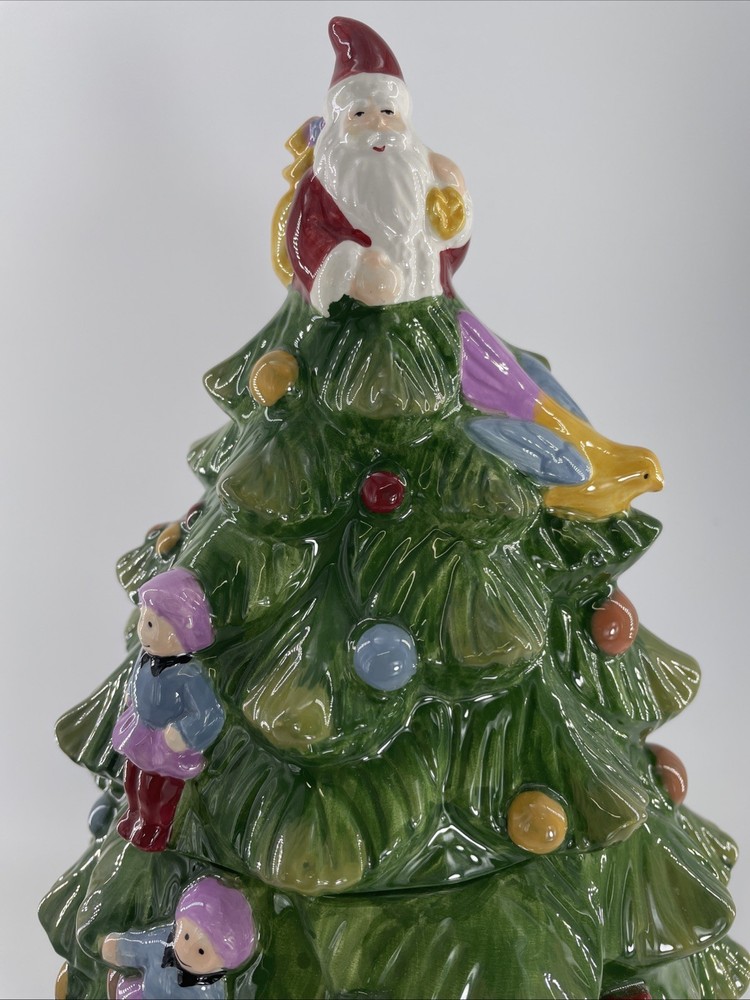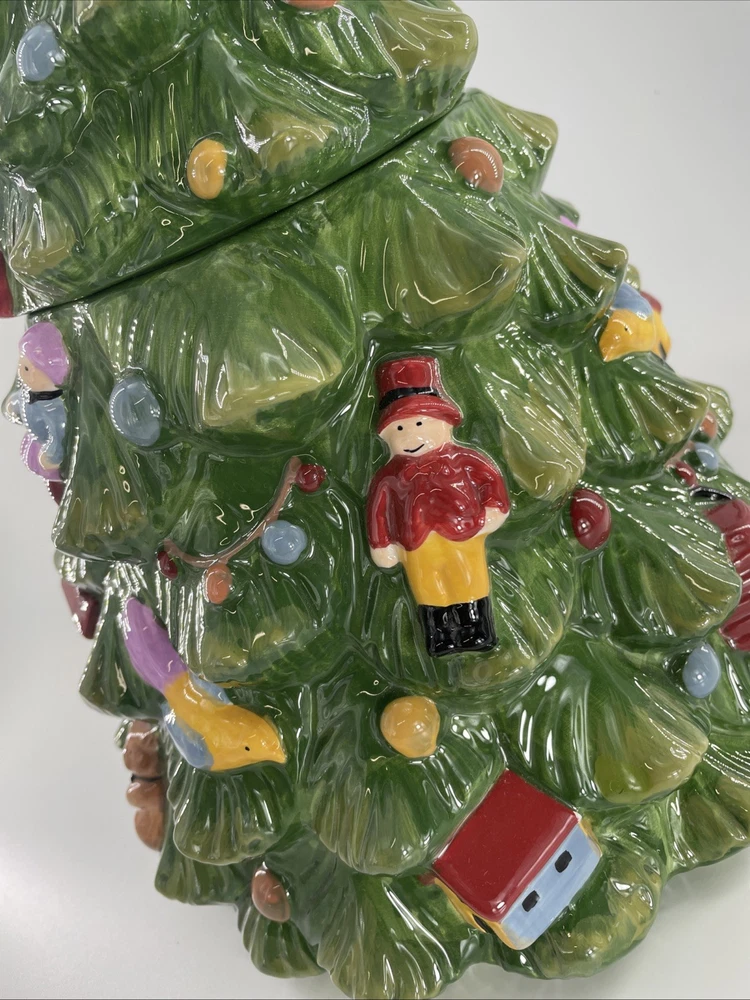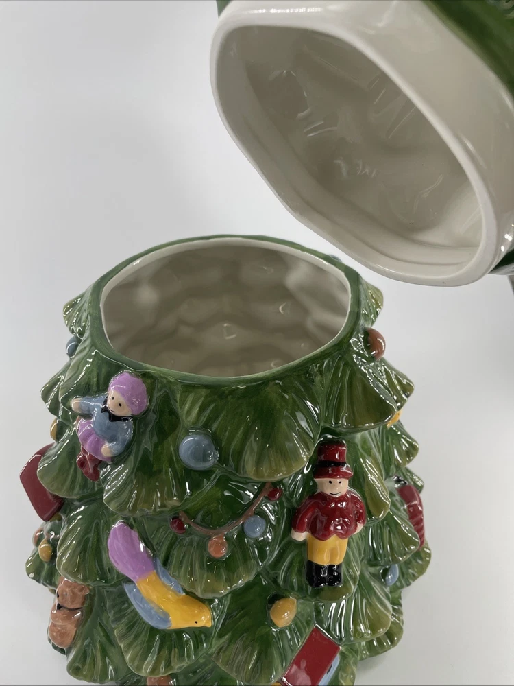 The Spode Christmas Cookie Jar is a handmade ceramic collectible featuring a multicolor Christmas design, perfect for storing seasonal treats. Manufactured in 1938, this vintage piece from the brand Spode adds a charming touch to any holiday decor collection. With its unique and festive design, this cookie jar is a timeless classic that will bring joy to your Christmas celebrations for years to come. I would like to disclose a couple of very tiny chips on the bird and I have put pictures in if you would like to take a look at the picture. They are so small they’re hard to find. Other than that, the cookie jar is in good condition.