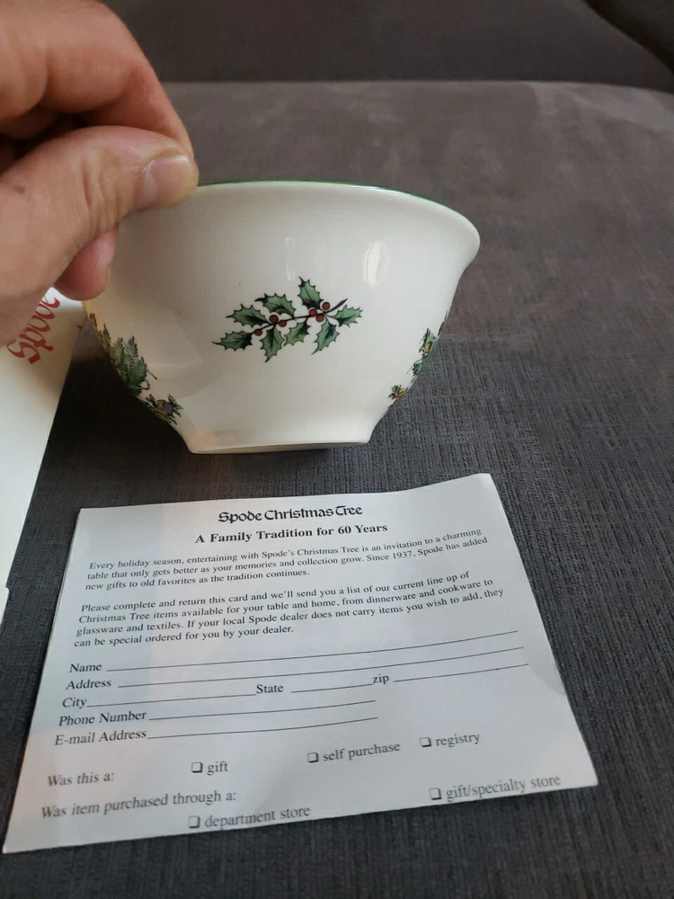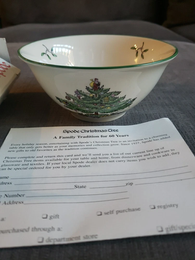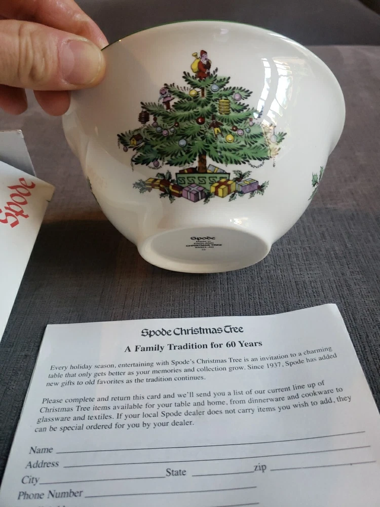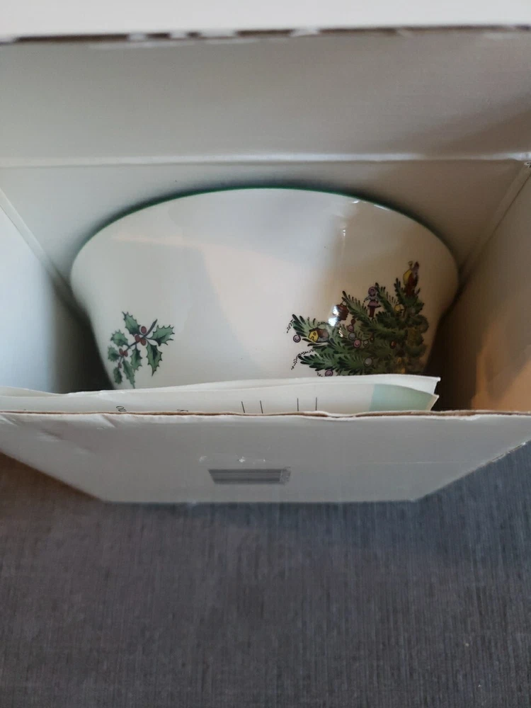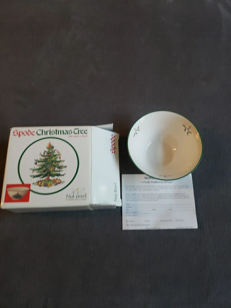 Add a touch of vintage charm to your Christmas table with this beautiful Spode nut bowl. Crafted in England during the 1980s, this porcelain bowl features a festive Christmas tree pattern in a round shape. The multi-color design adds a pop of color to any table setting and is perfect for serving nuts or other small treats. This vintage nut bowl is part of the Christmas Village product line and is an original piece. The production style is art pottery and the production technique is pottery. The bowl is 5.5 inches in diameter and comes with its original box. Get ready to impress your guests with this unique and beautiful piece during the holiday season.