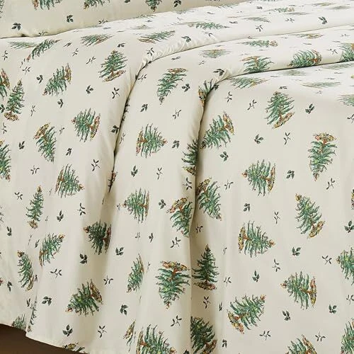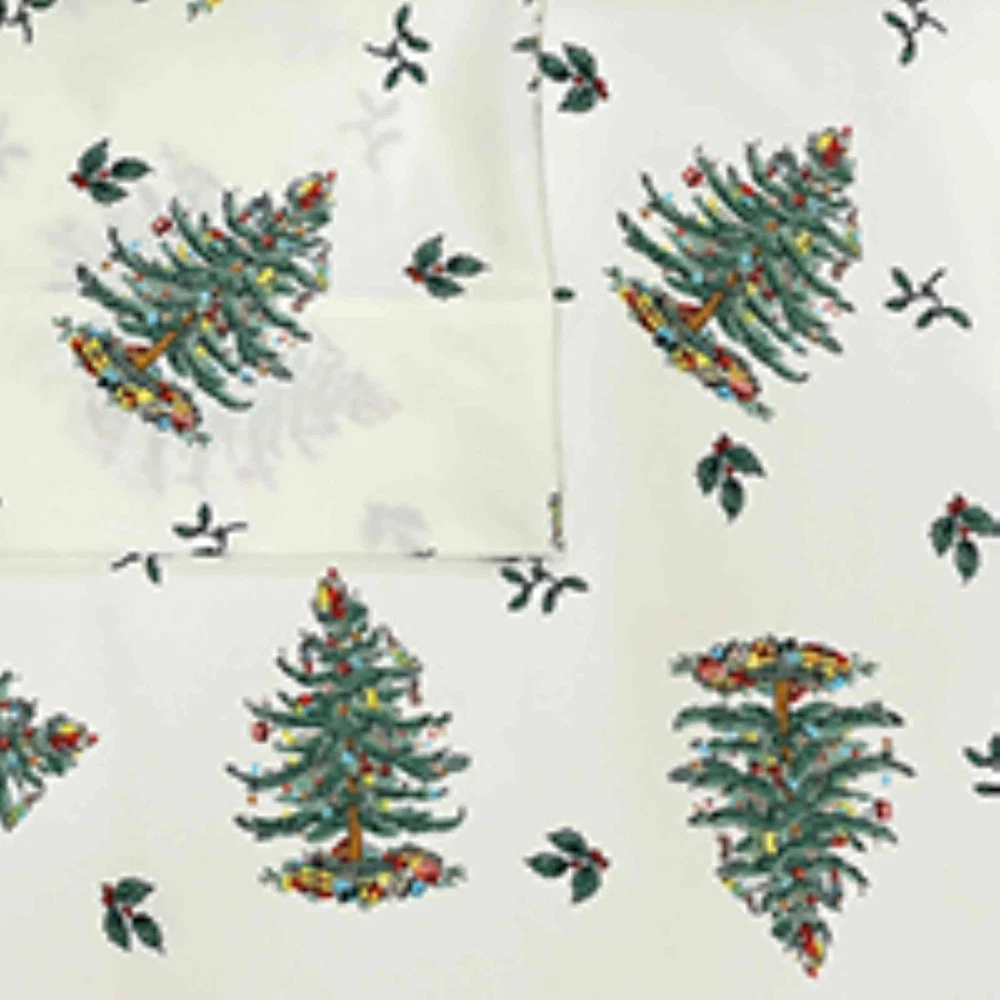 The Spode Christmas Tree 4-Piece Queen Sheet Set features the iconic Christmas Tree with ornaments and presents tossed in repeat surrounded by holly leaves and berries on a cream ground. Printed on 100% polyester. Set includes flat, 15" deep fitted sheets and 2 pillow cases. INCLUDES: (1) Flat sheet, (1) Fitted sheet, (2) Pillowcases MATERIALS & CARE: 100% Polyester. Machine wash cold, tumble dry low. DEEP POCKET: Fits mattresses up to 15". DETAIL: Features the iconic Christmas Tree with ornaments and presents tossed in repeat surrounded by holly leaves and berries on a cream ground. COLLECTION: Coordinate with the Spode Christmas Tree Collection including matching towels, tableclothes and more!