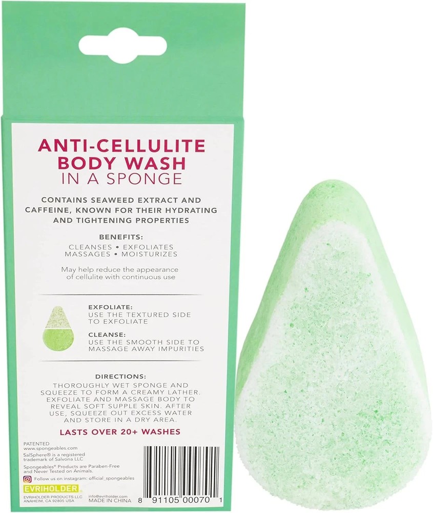 Product Dimensions : 7.25 x 3 x 6.5 inches; 14.85 ounces Item model number : S159A3P8-AMZ Manufacturer : Spongeables LLC Country of Origin : China Material: Sponge Color: Aloe Brand: Spongeables Style: Fresh Aloe Item Form: Sponge PREMIUM QUALITY: Each sponge is infused with an exquisite blend of ingredients shown to reduce the appearance of cellulite DUAL-TEXTURED: Use the buffer to treat cellulite, exfoliate, and soften skin; use the soft side to cleanse and moisturize SUPERIOR HYDRATION: Contains a moisturizing blend of olive oil and vitamin E to keep your skin hydrated and healthy all day long JUST ADD WATER: The soap is already in the sponge, so you just add water and squeeze to release the foamy cleanser and start scrubbing LONG LASTING: The soap will last for 20+ washes, and the sponge can be used with your favorite moisturizing body wash or cleanser long after the soap has been used up Featuring patented, revolutionary foam-release technology, these body sponges contain an exquisite blend of cleanser, moisturizing olive oil, seaweed extract, caffeine, and soothing aloe that will leave skin feeling soft and smooth after every use. Just add water to create a luxurious, at-home spa experience and release the rich lather.Directions for use: Thoroughly wet sponge and squeeze to release the creamy lather. Use the soft side to cleanse and moisturize. Flip it over and use the textured side to treat cellulite. Massage briskly in circular strokes. When finished, squeeze out any excess water and store in a dry place until next use.