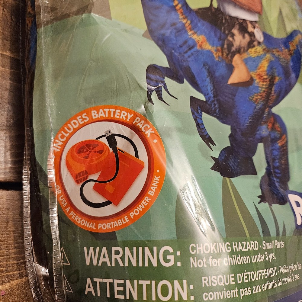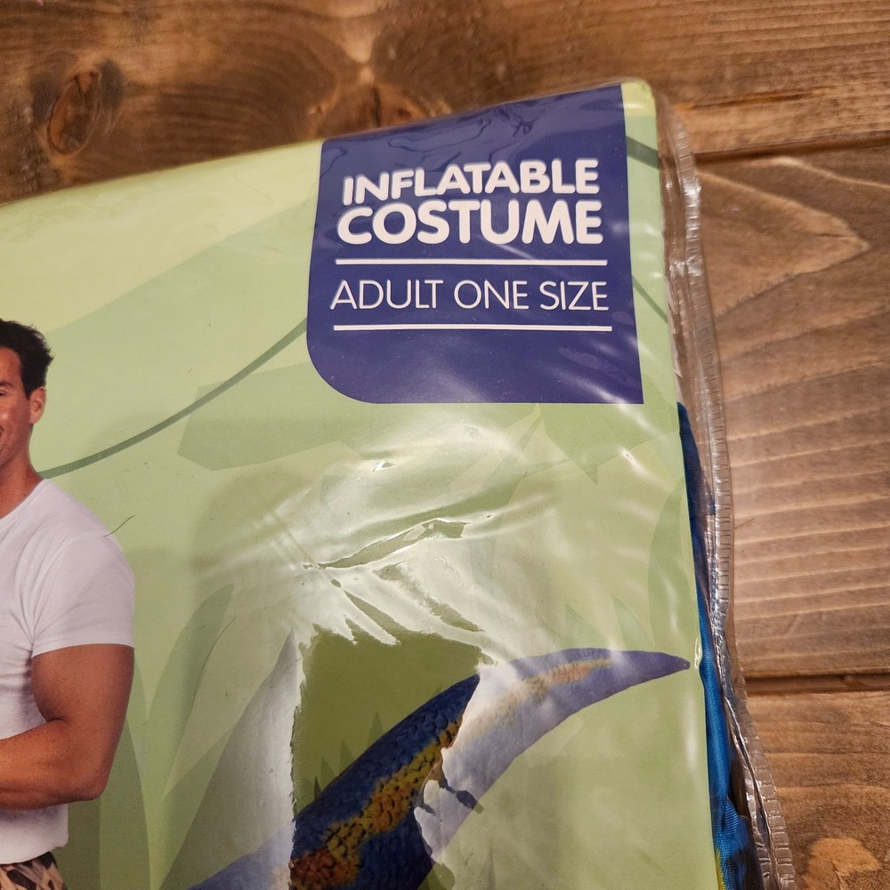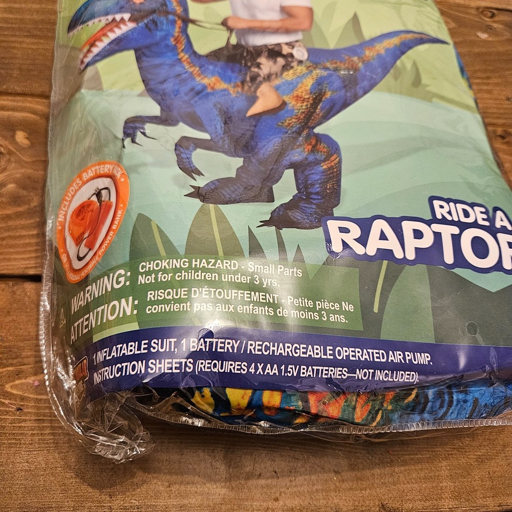 Adult inflatable “Ride a Raptor” dinosaur costume. Brand new and factory sealed in original packaging. This fun inflatable costume gives the illusion that you are riding a blue raptor dinosaur. Perfect for Halloween parties, costume events, cosplay, parades, or themed celebrations. Features: Adult one size fits most Inflatable dinosaur raptor design Includes battery-operated air pump Lightweight and easy to wear Fun, eye-catching novelty costume Includes: Inflatable costume Battery-operated air pump Instructions Note: Requires 4 AA batteries (not included). Not recommended for children under 3 years due to small parts. Condition: New / Sealed (Only opened to confirm contents) Ships fast and carefully packed from a smoke-free environment.