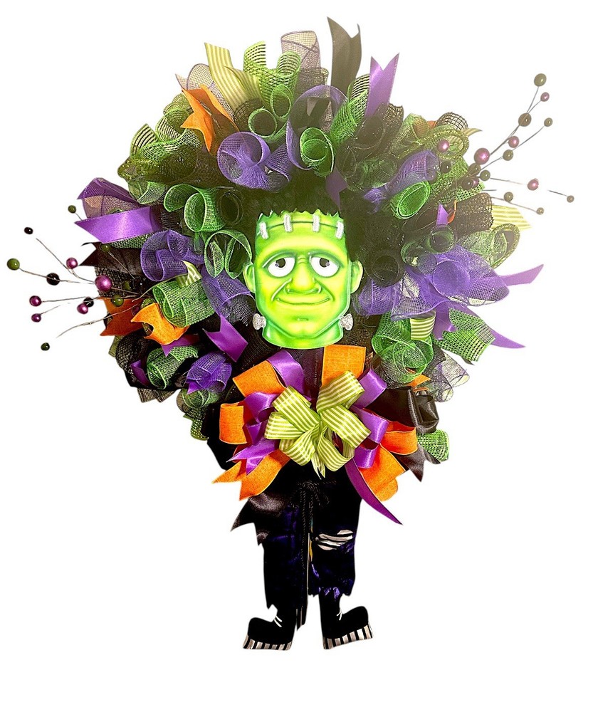 This Frankenstein Wreath is large and in charge! Length: 44” Width: 31” Depth: 18”. perfect for Halloween. Colors of green, purple, black and a touch of orange. The Frankenstein metal head has been adorned with fur hair, flocked and glittered stitches, purple rhinestones for the gleam in his eyes, and glittered screws in his neck.