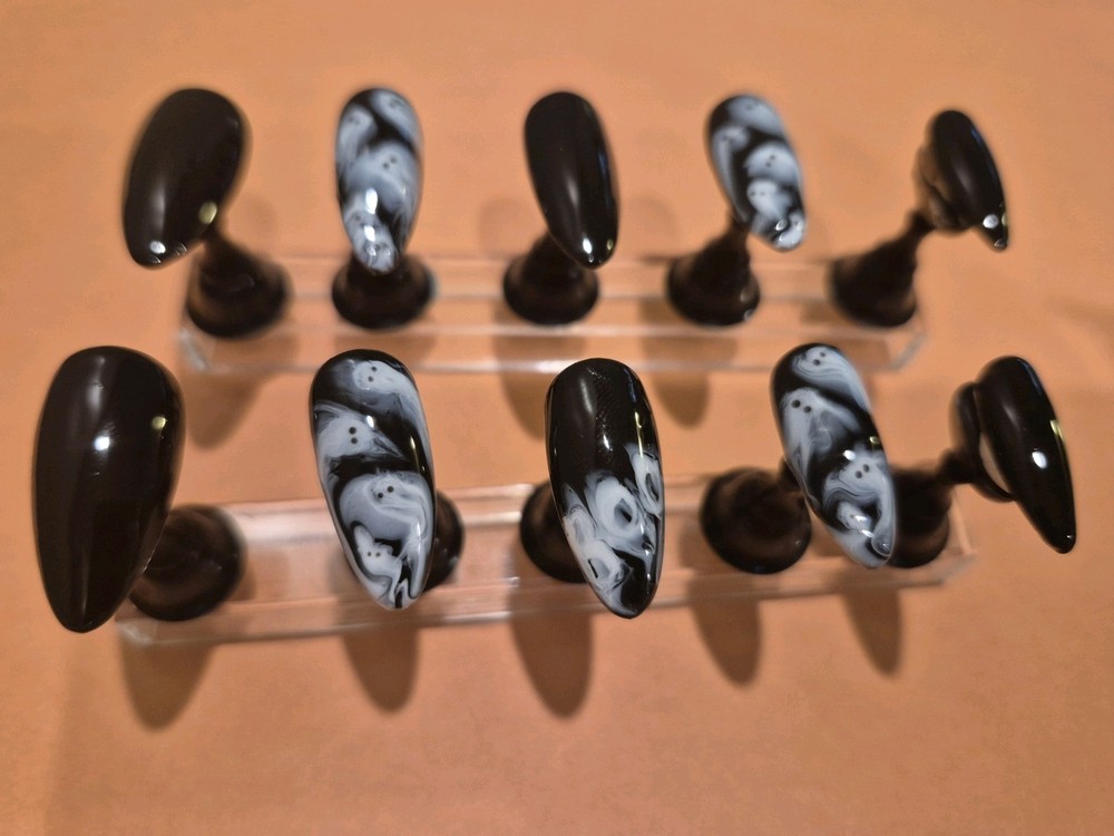 These Halloween Ghost Press-On Nails are perfect for adding a spooky touch to your nails! This set is a size LARGE and comes in a medium-almond shape. Get ready to rock some ghostly nails for the Halloween season!