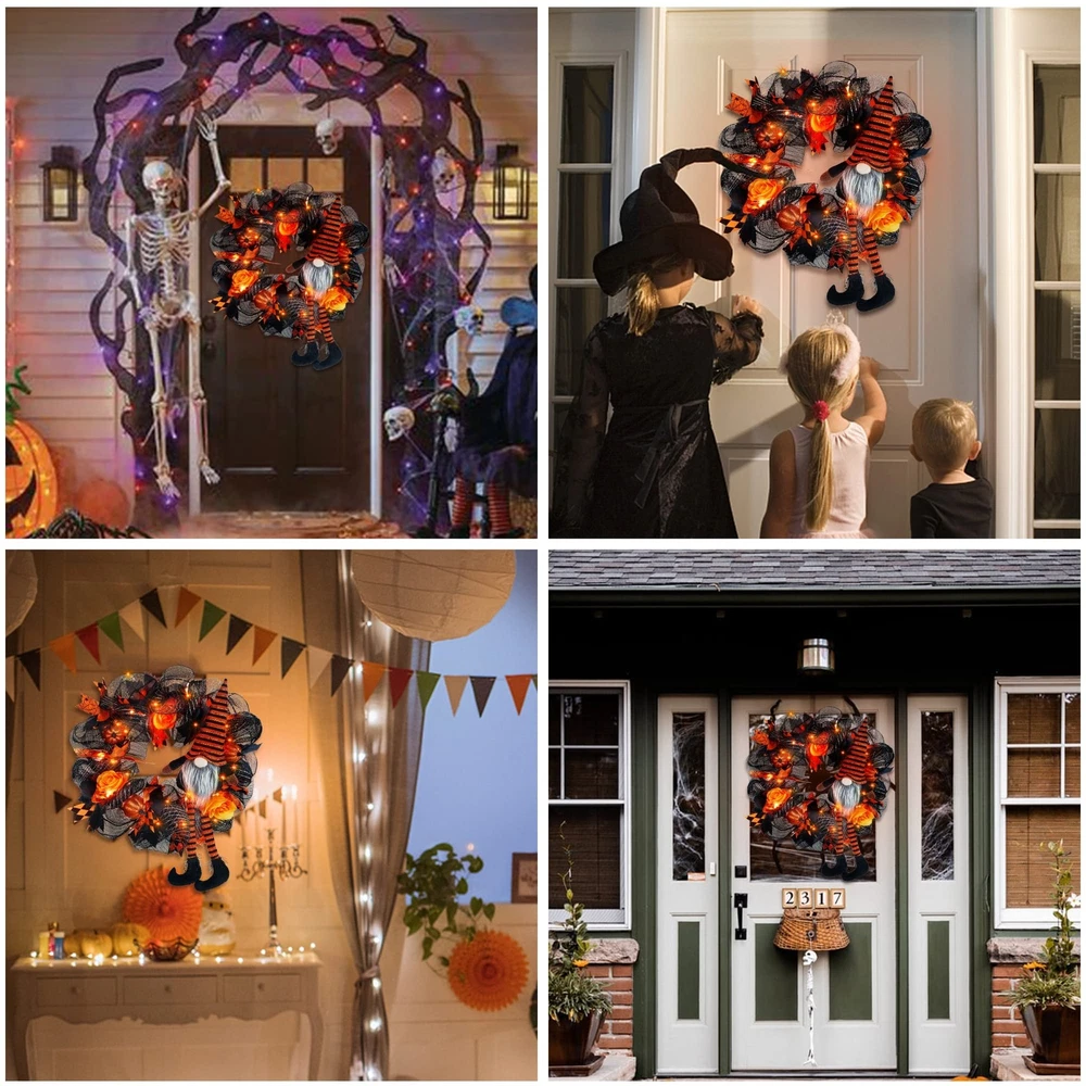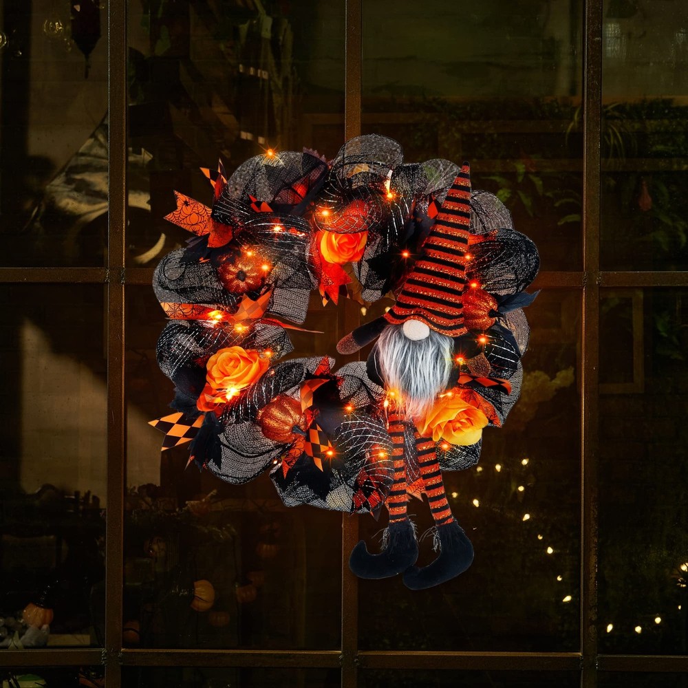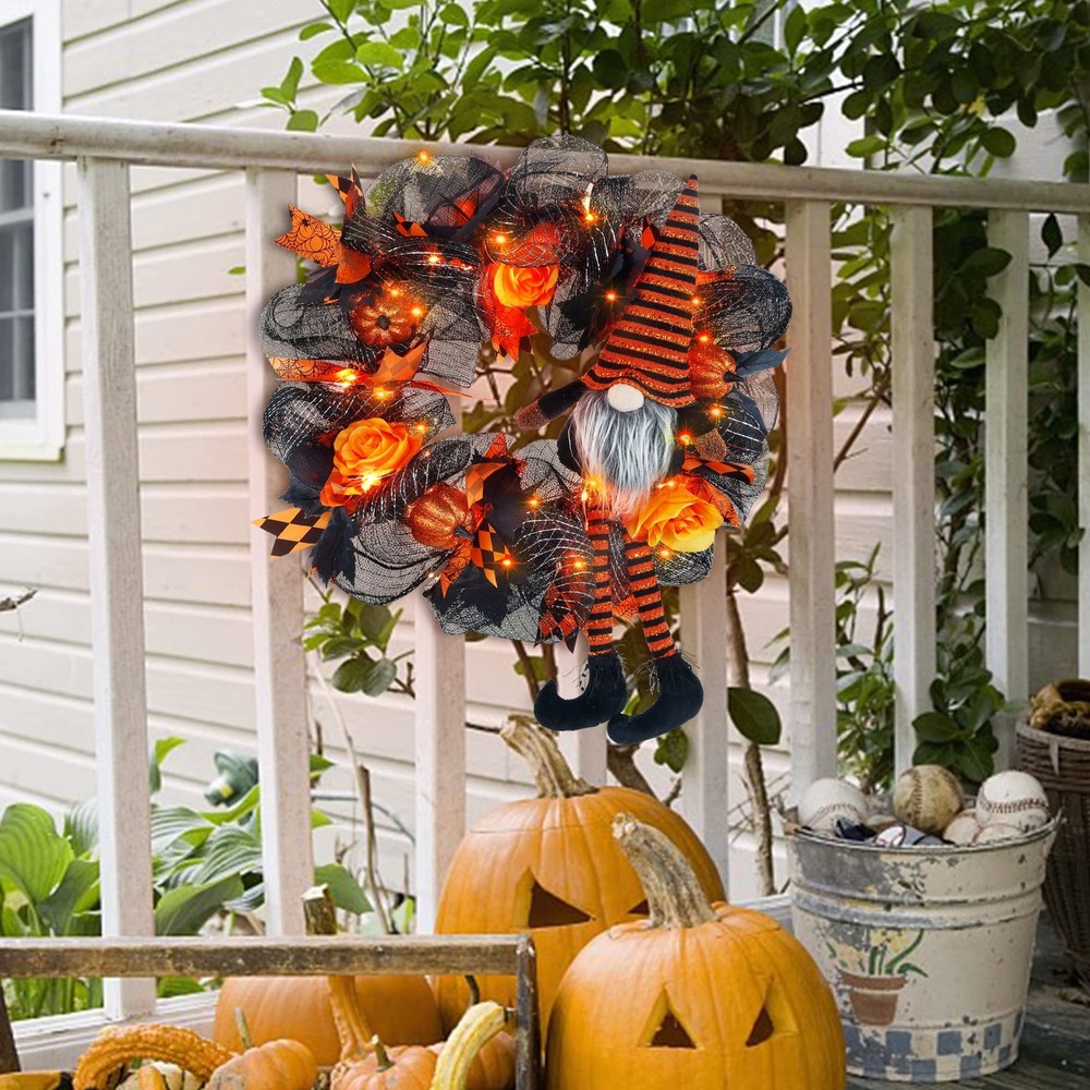 Halloween Wreath for Front Door, Halloween Gnome Outdoor Lighted Decorative Wreath 🧡 PREMIUM MATERIAL: This Halloween wreath are made of quality plastic and soft fabric, lightweight and easy to hang, each Halloween wreath decoration is carefully handcrafted, details may be different, but the whole is similar to the picture, each wreath is beautiful and unique. 🖤 LIGHTED HALLOWEEN WREATH: This Halloween wreaths for front door will come with 30 led copper string lights, powered by 2AAA batteries(not included), you can wrap the lights around the wreath according to your needs, it will emit an orange lights, helps to add more horrifying atmosphere to your Halloween decor. 🎃 HAPPY HALLOWEEN: This Halloween gnome wreath are designed with artificial black maple leaves, soft fabric gnome, orange power coated pumpkins, faux roses, black woven mesh with silver thread embellishment, rhombus printing and spider web printing ribbons, vivid colorful and unique design will become a beautiful landscape and make a big difference in your house 🚪 VERSATILE USE: The 17" front door wreath is sure to be an attractive addition for Halloween indoor and outdoor decoration! Hang it on the front door, living room, fireplace, cabinets, walls, windows, shelves or any other places to get more Halloween atmosphere. If it is outdoors, it is recommended to hang it on the covered porch to avoid direct sunlight and rain. 🏰 HALLOWEEN PARTY DECORATIONS: Black and orange wreath is the perfect mix between spooky and chic, use this Halloween wreath as a party decoration or a door decoration to invite your friends to join the crazy Halloween party! This wreath door ornament is perfect for Halloween wall decorations, Halloween door decorations, Halloween window decorations, Halloween party favors, spooky party favors, Halloween photo props and more!