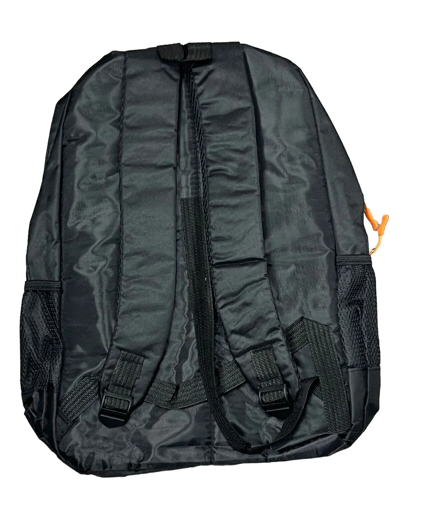 Sport Bag Backpack Black 3 Zipper Closure Compartments 2 Water Bottle Exterior Mesh Pockets Lightweight Travel Carry On Adjustable Straps Light Padding in Largest Compartment Orange Zipper Pull Tabs 18H 13x6 Base inches