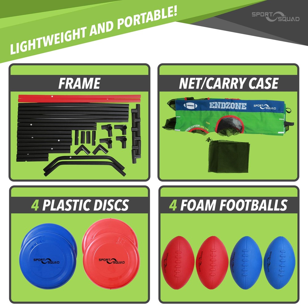 Sport Squad 2-in-1 Football and Disc Toss EndZone Challenge Assembly: Just snap the pieces together for fast assembly No tools needed Game Set Features: Dual game set with both football toss and disc toss Custom scoring system lets you recreate carnival games, tailgate games, or create your own game All weather material that’s sturdy enough for both indoor and outdoor use Comes with 4 footballs, 4 flying discs, and a sliding scorer in a convenient carrying bag Game Set Specifications: Dimensions: 31”L x 31”W x 68”H Weight : 9bs Sport Squad’s 2-in-1 Football and Disc Toss EndZone Challenge is the newest game to come to tailgating! The football game features labeled targets where you can score a touchdown or even throw an interception. Bring the fun of Sunday night football to your backyard or use the portable carrying bag to tailgate the big game! Challenge your competition and keep score using the sliding scorer on the side of the game system. Switch between football and disc toss to keep the fun flowing. Challenge yourself in disc toss by trying to score more points by throwing the disc into the small upper opening or play it safe by throwing at the larger bottom opening. This game system is easy to assemble, making it the perfect addition to any family game night or tailgate. PLAY ANYWHERE: Take this fun toss game with you to the beach, backyard, tailgate, or family gathering to ensure a fun time is had by all. The lightweight design of the Endzone Challenge target toss makes it one of the best portable lawn games out there! QUICK AND EASY ASSEMBLY: With the lightweight and durable design of the tubing you can play in just minutes! All you need to do is insert the tubes into the connectors and slide on the fabric playing surface. Once completed you are ready to play! INCLUDES 4 FOOTBALLS AND 4 FLYING DISCS: The Endzone Challenge Target Toss Game Set comes with 4 foam footballs & 4 plastic discs. Great way to practice your toss skills on your own or compete with friends. Keep track of scores with the slidable scorer SPORT SQUAD - BRINGING FAMILY AND FRIENDS TOGETHER: As an American based company, Sport Squad brings new innovation to playing indoors and outdoors by introducing affordable, quality sports, lawn, tailgate, carnival, and game room games to market