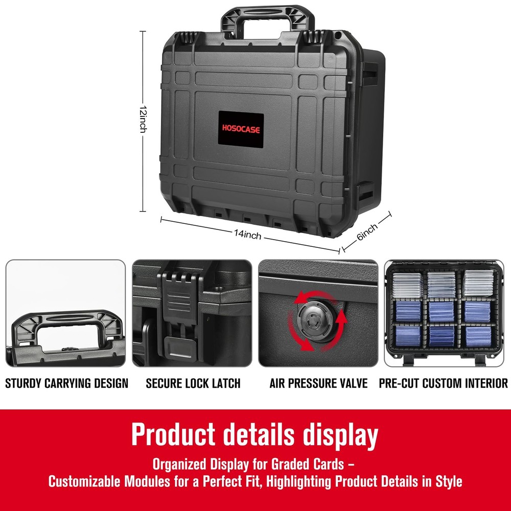 Sports Card Case Storage Box: Trading Cards Box for PSA Graded Medium Product Details [Versatile Storage for All Graded Card Types]: This premium card storage box is perfect for a wide range of cards (500+) , including graded cards (PSA, GMA, BGS, HGA, SGC, and CSG), Toploaders, magnetic cards, and more. It accommodates sports cards, game cards, and even gaming or collectible cards, making it an excellent trading card storage solution [Trading Card Case Customizable Design]: Designed with ample space, this graded card storage box can securely hold hundreds of cards. It features 6 removable dividers, allowing for a fully adjustable interior to fit your needs—perfect for organizing your sports card case, travel carry case, or even a playing card case [Baseball Card Storage Box with Durable Construction]: Built from high-quality PP material, this graded card case is impact-resistant and offers outstanding protection. Whether you’re storing baseball cards, trading card cases, or other valuable collectibles, the sturdy construction ensures your cards remain safe from damage [IP67 Waterproof for Sports Card Case ]: With an IP67 rating, this hard case with foam keeps your card display case free from water, dust, and debris. It’s the ideal solution for preserving the condition of your collectibles, such as game card cases and sports card cases, even in challenging environments