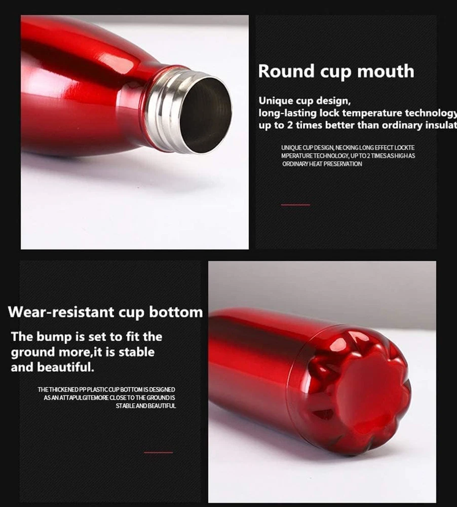 TOXIN FREE AND COMPLETELY SAFE - Worried about chemical contamination? Buy this sports water bottle for complete peace of mind. It's made entirely from completely hygienic, food-grade stainless steel. This means it's 100% BPA and phthalate-free - making it completely safe for all the family, including small children. TOUGH & LIGHTWEIGHT - Designed for life, these water bottles boast a premium quality, stainless steel build. It makes them much more durable than glass based vacuum flasks - and better able to handle a knock or drop when on the move. Lightweight, leak-proof and easy to carry, this water bottle is the ideal drinking companion for jogging, walking, cycling, triathlon, camping, fishing trips and more. Stay cool or keep warm :Unique double walled vacuum insulation technology with vacuum-seal cap keeps your drink cold for up to 24 hours or hot up to 12 hours.What a surprise! Enjoy all kinds of cool and fresh in summer, enjoy the warmth in cold winter. Suitable for cold water, Iced Coffee,hot drinks, hot coffee, hot chocolate,etc. Perfect for office workers,students,sports,outdoor enthusiasts, breast-feeding mothers, etc. Easy to carry and easy to clean : Perfect size for your gym bag, car, bicycle and backpack to enjoy your long hikes, sports, go to work, go to beach, school, office, picnic, hiking, camping, cycling,road trips, eat lunch out, on the road for soup, traveling, trip, driving, mountaineering, backpacking, hot yoga, gym, fitness. Order more than 50, you can customize the logo for free laser. For example: corporate anniversary promotion, holiday gift distribution, event souvenirs, meeting, etc.; according to customer requirements to make different styles, size, color and LOGO as corporate promotional items or gifts, cups can be printed logo, phone, address, two-dimensional Code, related product pictures, etc. ●Functions: ●1. Leak-proof,Rust proof and Durable Quality:High-quality food grade 18/304 stainless steel on both inside and outside walls. This will never rust or leave a bad metal taste in your mouth. 100% BPA Free for heath-safety. ●2. Unique Vacuum Insulation Technology: The double-walled vacuum insulated exterior will keep your drink cold for up to 24 hours or hot up to 12 hours. ●3. Keeps Your Drink Hot & Cold:Great for cold water, Iced Coffee, hot drinks, hot coffee, hot chocolate,etc. ●4. No Leaks:The exterior will never sweat. Don't worry about getting water on your desk, rings on your table, or a mess in your bag! ●5. Perfect Size & Easy to carry: The capacity is large enough to fit your daily hydration needs. Fashion cola style,easy and comfortable hold in hand and drink. And it is fit most cupholders.Put your portable sports water bottle in your gym bag, backpack or briefcase as your daily companion. ●6. Sweet and Love Gift:Both Men and Women are in fashion. Especially suitable for kids, older and adult. ●indulated water bottle will to be your friend.Enjoy all kinds of cool and fresh in summer,and enjoy the warmth in cold winter. ●Feature: ●Material: 304 stainless steel ●Capacity: 17 ounces (500ml) ●Mouth Diameter: 3.4cm/1.3 inch ●Bottle Dimension: 7 x 26.5 cm/2.7 x 10.4 inch ●Package included: ●1 x watter bottle