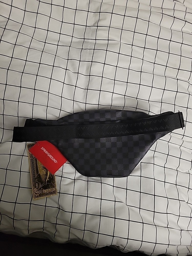 Features: Adjustable Strap, Inner Pockets, Lightweight, Limited Edition, Organizer Size: Medium Department: Men Brand: Sprayground Closure: Zip Color: Black Lining Material: Fabric Material: Polyester Style: Crossbody Theme: Art, Classic, Colorful, Designer, Grunge, Halloween, Hip Hop, Hippie, Hipster, Holiday Occasion: Casual, Travel Pattern: Checkered