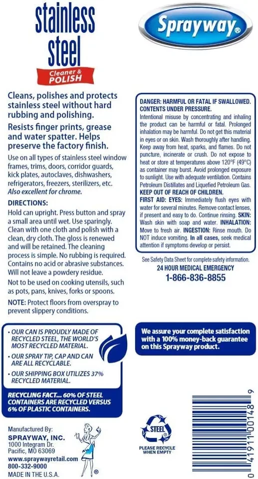Sprayway Stainless Steel Cleaner is by far the worlds best cleaner and polish on the market with no greasy or powdery residue and great for removing finger prints. Sprayway products are ed and trted by professionals everywhere and is oil based and contains no acid or abrasive substances and can be ed indoors and outdoors for professional results. Cleans, Polishes, Preserves, Protects The worlds best cleaner and polish on the market No greasy or powdery residue and great for removing finger prints. Contains no acid or abrasive substances and can be ed indoors and outdoors for professional results. Leaves No Fingerprints or Streak