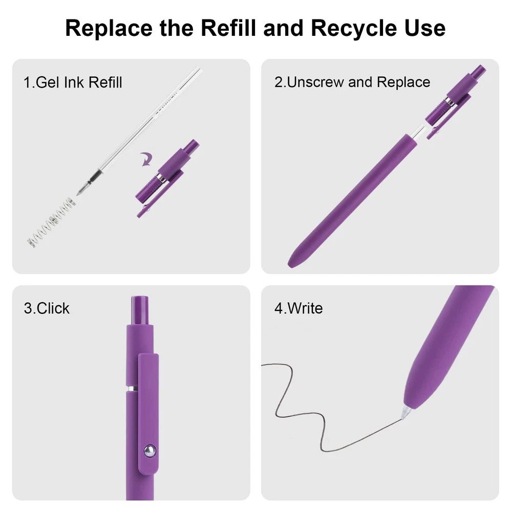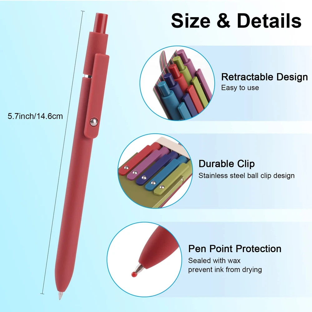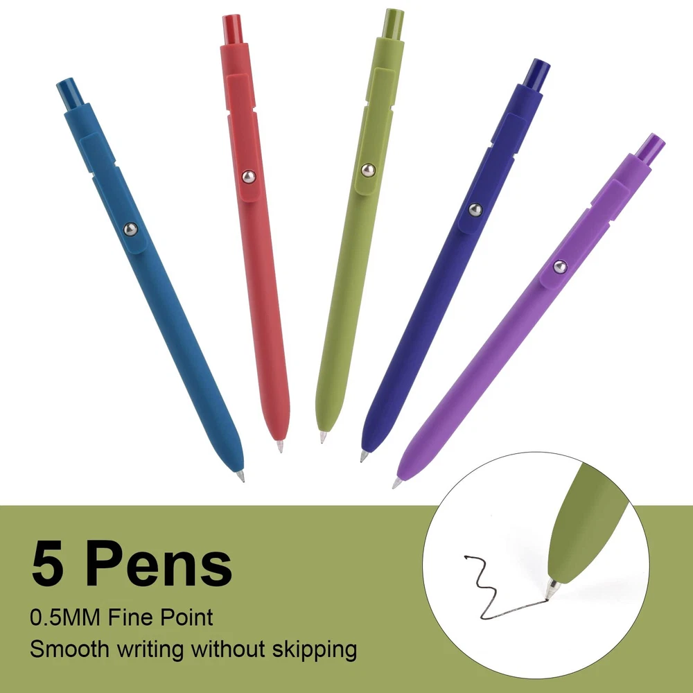 SMOOTH WRITING: The tip of the gel ink pen consists of a 0.5 mm roller ball for smooth writing. These quick-drying black ink pens adopt reliable ink that won't fade or smudge easily, keeping pages clean and tidy.(Please lay the pen flat or click close after use to extend the service life of the pen tip) RETRACTABLE DESIGN: 5 Pack of ballpoint pens in different colors are specially designed for fashion conscious. Easy to use, click to open/close. The satisfying click response makes it a great way to relieve stress and be inspired. HIGH-QUALITY MATERIALS : This gel pen is easy to hold. With the super soft and comfortable grip, you will not feel tired after writing for a long time, and will love the fine point and the soft touch feel. PRACTICAL PEN CLIP: The Pen clip with little steel ball design can be firmly clipped to books, notebooks or pockets. Easy to carry and prevent loss. Also, the little steel ball on the clip are fun to spin. PERFECT GIFT: These retractable gel ink pens great for home school office supplies, enough quantity to meet your daily use.The prefect gift for family/ friends/ coworkers/ holidays. Please feel free to contact us if you have any issues with the product.