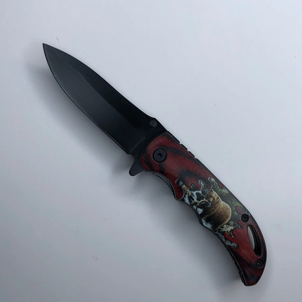 Unique Design: Eye-catching bear-themed design Spring-Assisted Opening: Fast and easy blade deployment Durable Blade: 3" drop point blade made from German surgical steel (3mm thick) Convenient Carry: Includes a pocket/belt clip for easy EDC Easy Storage: Quickly folds for safe storage Overall Length: 7 inches for a good balance of size and portability Great for: EDC, outdoor activities, camping, hiking, everyday tasks We strive for positive Feedback on all transactions. Your satisfaction is very important to us, if you experience a problem of any kind with your purchase please contact us first before leaving any feedback or opening any claims, any issues will be resolved more efficiently if you contact us first and deal directly with us. We do stand behind our products and will do anything in our power to make sure that you feel satisfied with your purchase. If you are not happy with your purchase, quality, DOA items. PLEASE email us , We would be more than happy to replace the item. Thank you for the cooperation.