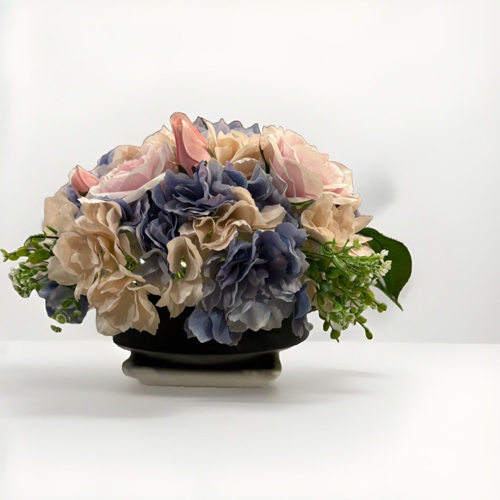 This is a preowned floral arrangement centerpiece designed for the spring season. The arrangement features a mixture of artificial roses in a multicolor palette, set in a 14-inch glass planter. The flowers are made of high-quality artificial silk, handcrafted into a beautiful 16-inch centerpiece. Additionally, the arrangement includes built-in LED lights powered by batteries to add a charming touch to any home décor. This faux floral arrangement is perfect for adding a touch of elegance and springtime charm to any room. Container is black glass, barely visible to allow flowers to pop. Returns accepted 30 days; buyer pays return shipping