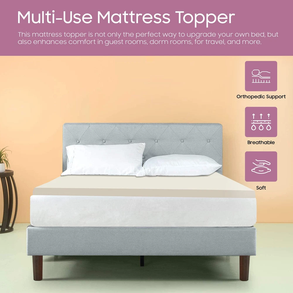 The Spring Sleep 1-inch premium high-density foam adds luxurious softness while not taking away from the support of the mattress. These bed toppers have been effective in enhancing the comfort level of new and old mattresses alike, providing a better sleep experience for most people. This Breathable Foam Topper is made from good quality foam that gently cradles you in individualized comfort and support. It also provides you with pressure-relieving cushioning in the hip and shoulder areas while still supplying enough support, so the body doesn't get imbalanced. These unique mattress toppers are to be used on top of your mattress for additional comfort. This prevents your body from sinking and curling while sleeping and promotes a better posture, which reduces and strain on your spine and increases energy levels during the day. Our premium-level mattresses are here to help you get the best possible comfort at all times when you sleep or lie down to relax. Comfort: A mattress topper can add an extra layer of comfort to your mattress, making it feel softer and more luxurious. This can be especially beneficial if you have a firm or uncomfortable mattress. Support: Toppers can provide additional support to your body while you sleep. This can help alleviate pain and pressure points and promote better alignment of your spine. CertiPUR-US certified foam: Rest easy knowing that the topper's foams are CertiPUR-US certified, meeting stringent standards for durability, performance, and content. Quality you can trust. Temperature regulation: Mattress toppers are designed to regulate temperature and keep you cool during the night. This can be especially beneficial if you tend to overheat while you sleep. Cost-effective: If you're not ready to invest in a new mattress, a mattress topper can be a cost-effective solution to improve your sleep experience. It's also easier to replace a topper than a mattress, which can be a more affordable option in the long run.